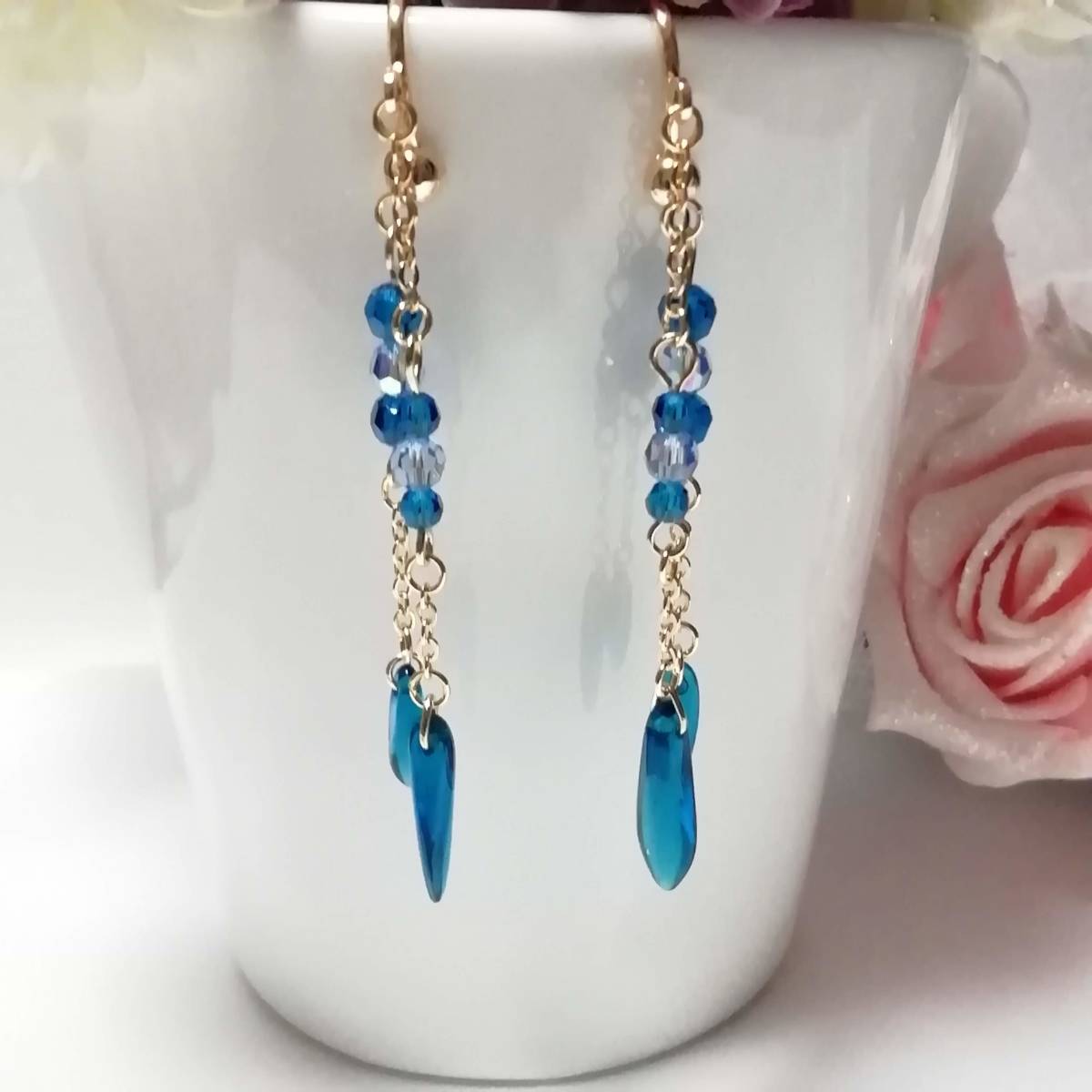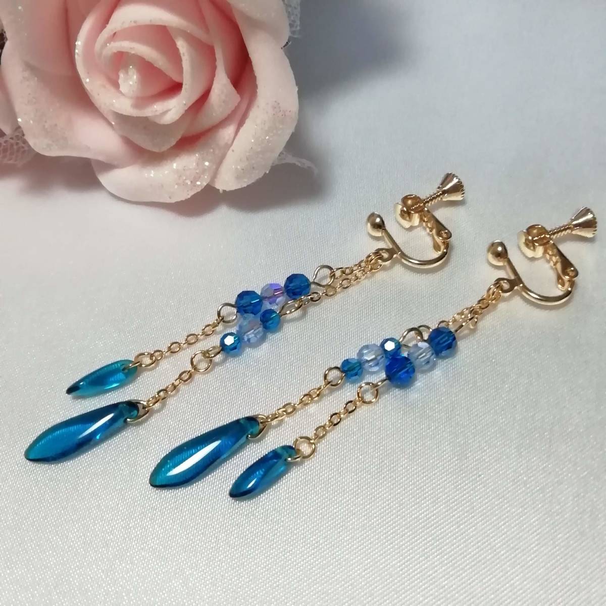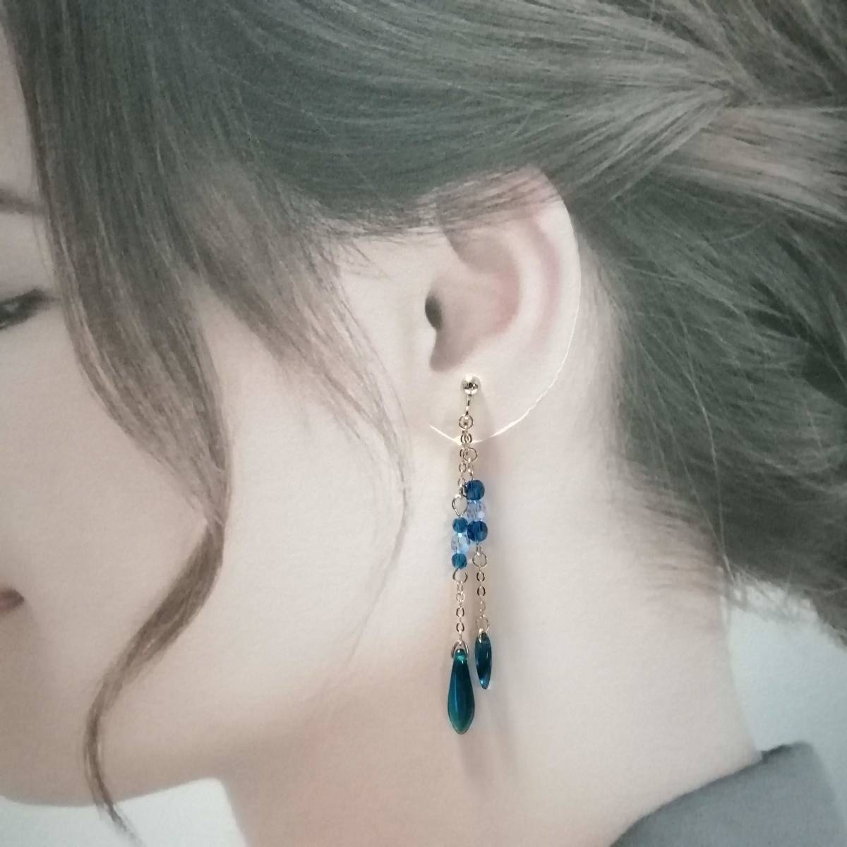 | ★商品内容★ チェコダガーカプリブルーのハンドメイドイヤリング★チェコ/ゴールド/上品/カプリブルー/スワロフスキー/ライトサファイア/ダガー/爽やか チェコダガーとスワロフスキーのカプリブルービーズを ゴールドパーツと組み合わせた 爽やかな印象的なイヤリングです。*・.**.・。**.・。*・**。・ 間に挟んだスワロフスキーライトサファイアの煌きも美しく 上品でスタイリッシュな大人の女性らしさを印象付けます*・.**.・。**.・。*・**。・ 普段使いはもちろん、お出掛けにも イベントなどのお洒落のワンポイントにも最適です*・**.・。**.・。*・**。・ 【素材】 チェコダガー カプリブルー5mmx16mm チェコダガー カプリブルー3mmx10mm スワロフスキー5000ダイヤカット ライトサファイアAB4mm スワロフスキー5000ダイヤカット カプリブルー4mm スワロフスキー5000ダイヤカット カプリブルー3mm k16GPチェーン カンより垂れ下がる長さは、約5.8㎝です。 Eー1103 ★注意事項★ ***~ご購入前に必ずお読み下さい~*** *・*・*落札後について*・*・* *落札後4日以内にお手続き、ご連絡が無い場合は落札者都合で削除致します。 *発送日指定・ご入金の予定が1週間以上先をお考えの方は、入札の前に質問よりご連絡くださいませ。 予めご了承の上、ノークレーム・ノーリターンでお願い致します。 *・*・*商品について*・*・* *一点一点心を込めて作っておりますが、手作りなため多少の歪み等あるかもしれません。 手作りの味わいと、世界で一つだけの作品とお考えいただければ幸いです。 *デリケートな商品ですので、強く引っ張ったりすると破損する事もあります。 お取り扱いにはご注意ください。 *ご覧のPC、スマホによっては画像と実物の色味が多少異なる場合があります。 *基本イヤリング金具は跳ね上げネジ付き金具にて作成しております。 **ご希望によりピアスへの変更も承っております。 【フックピアス…無料/キャッチピアス…別途追加料金120円】 *その他…樹脂ノンホールピアス(無料)・カン付き樹脂ノンホールピアス(無料)にも変更をお受け致します。 ~ご注文の際にメッセージ欄よりお申し付け下さい~ 尚、金具変更のご希望が無い場合は、掲載された写真の金具にてお送り致します。 *金属アレルギーや化学物質アレルギーなどへの対応はしておりませんので、ご心配な方はご遠慮下さいますようお願い致します。 *永くご愛用頂くために、ご使用後は柔らかい布等で軽く拭いてください。 *・*・*プレゼント用梱包のご要望もお受けいたします*・*・* *その際は、梱包費用が別途で必要となりますのでご注意ください。 また、ご希望の梱包タイプによって、発送方法が変わりますので、送料が別途必要となります。 *プレゼント用梱包タイプ 【袋→100円】 ~発送方法【クリックポスト(送料無料)】⇒【合計100円の追加料金】 *プレゼント用梱包タイプ 【箱→200円】 ~発送方法【レターパックプラス(別途520円)】⇒【合計720円の追加料金】 となります。 ◆ご希望の場合は、必ず商品ページをウォッチリストに登録した上で落札前に質問にてお問合せ下さい。◆ ◆ご希望を承り次第、一度出品を取り消し、プレゼント用梱包費用、送料などを追加した金額へ変更し、再出品致します。◆ *再出品後に再度検索して頂く手間が省けますため、プレゼント梱包をご希望の場合は必ずウォッチリストへのご登録をお願い致します。 金額変更後の再出品から3日以内に落札されなかった場合、誠に勝手ながら購入する意思がないとみなしまして、元の金額へ修正致します。 また、修正後、再度プレゼント用梱包のご希望のお問い合わせを頂きましても、お断りをさせていただきますのでご注意ください。 ご不明な点がございましたら、落札前に質問よりお願い致します。 ***ご質問について*** *ご購入前にお願い致します。 日中は仕事をしておりますので、ご返事が直ぐに出来ない場合がございます。 出来る限り早い対応を心がけますが、ご了承ください。 また、発送までには、お振込み確認後、翌日の発送を心がけておりますが、仕事の都合により2~3日程かかる場合がございます。(その際にはナビにてご連絡いたします) お急ぎの場合は、極力対応いたしますが、場合によっては対応致しかねる事もあります。ご了承下さいませ。 | |||