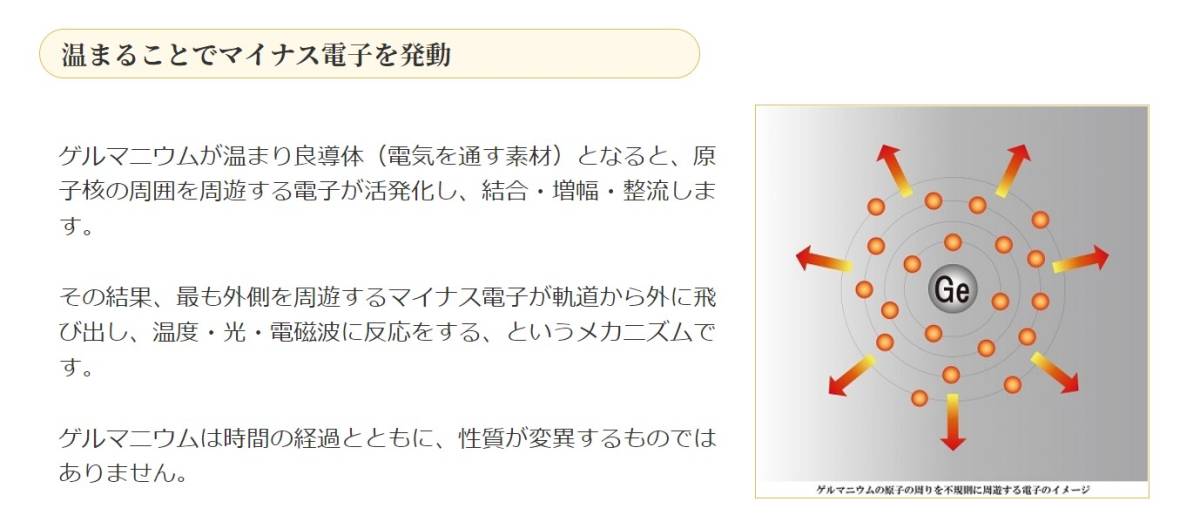 半導体であるゲルマニウムは32℃以上になると電気を通す導体となり、電気を帯びた物質と結合する性質があります。