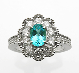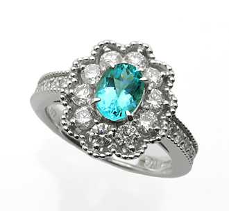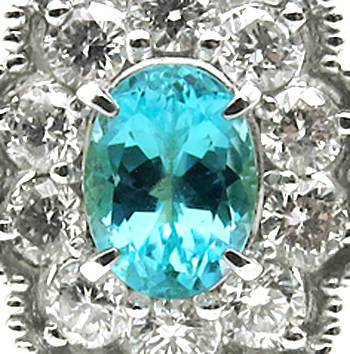 宝石詳細:0.736ct 6.70x4.94x3.48mm ブライトブルーグリーン(日本色彩研究所) アイクリーン 分析数値CuO:0.50% MnO:0.93%/