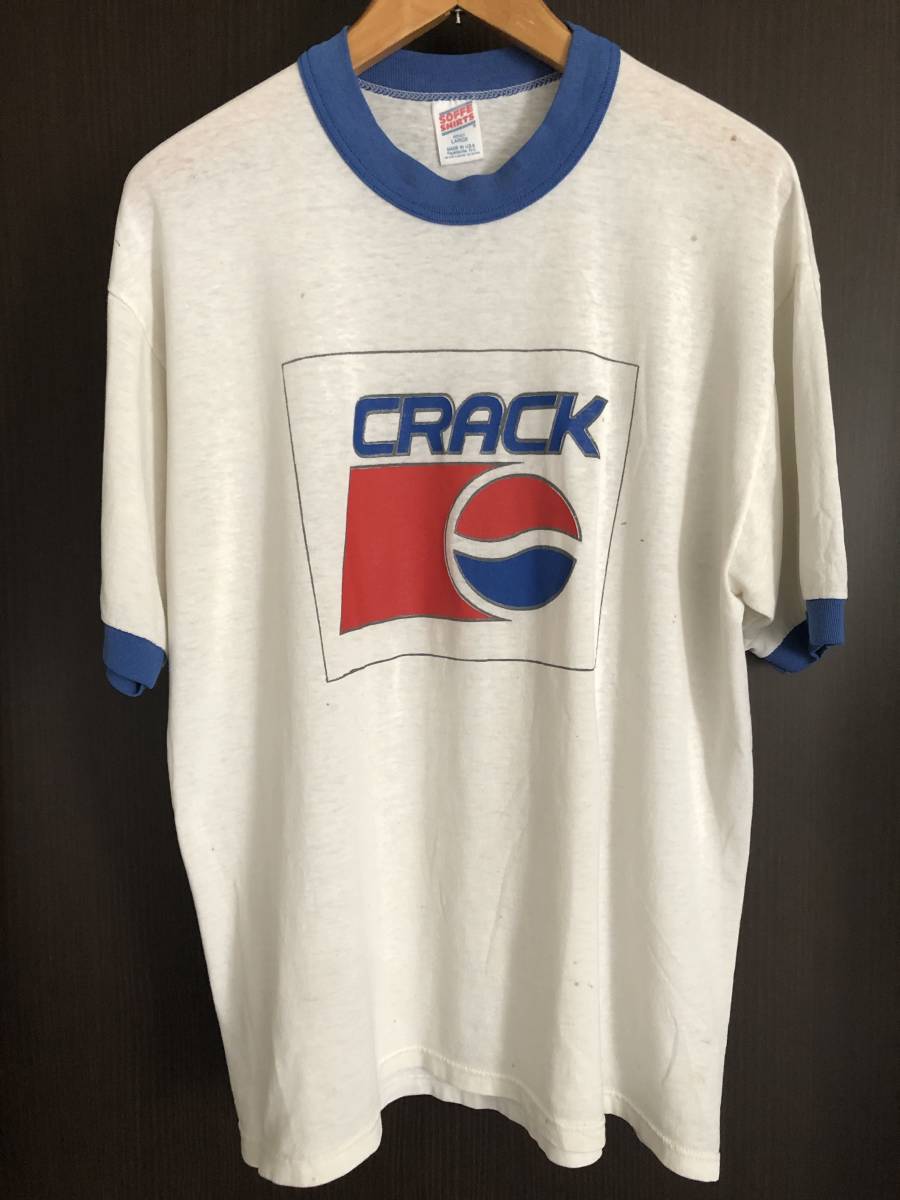 80-90s送料無料CRACK/L丸首パロディリンガーTシャツ【レア珍品USA製アメリカ購入】OLDused古着服アメカジひび割れ目コーク(Coke)ビンテージ