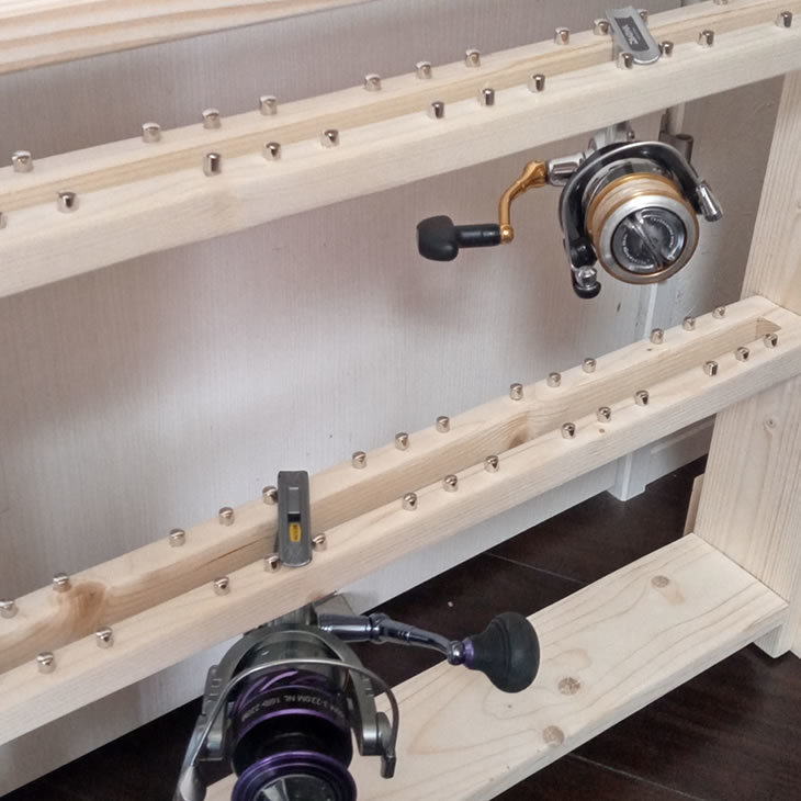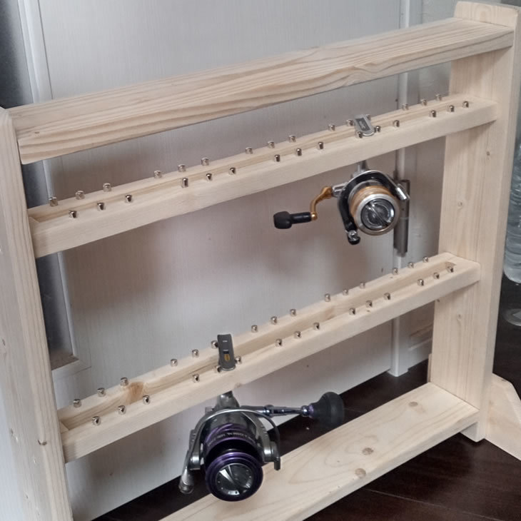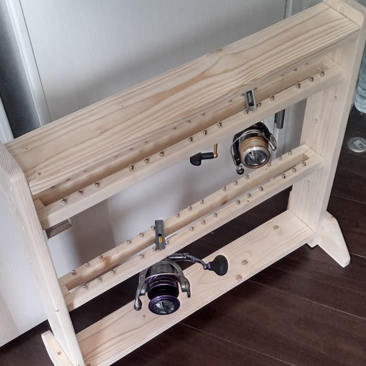 リールスタンド 受注生産ハンドメイド 無塗装【受注生産】リール10本掛、小物棚付