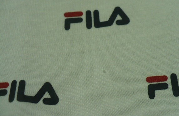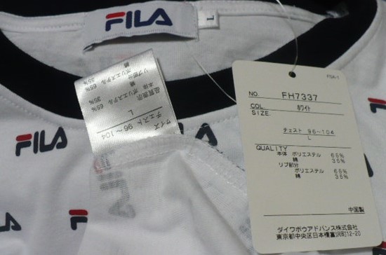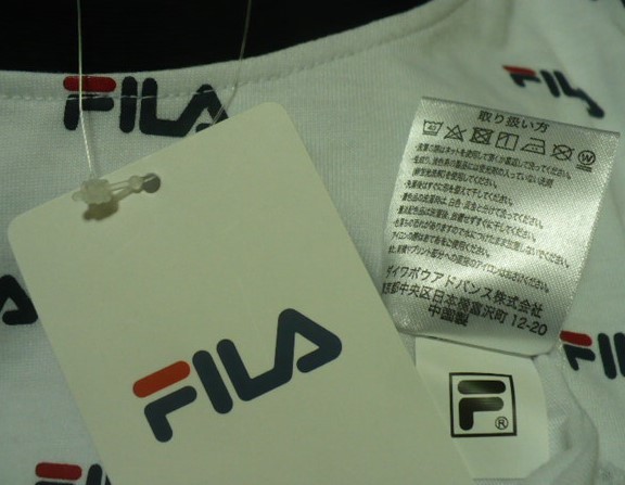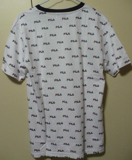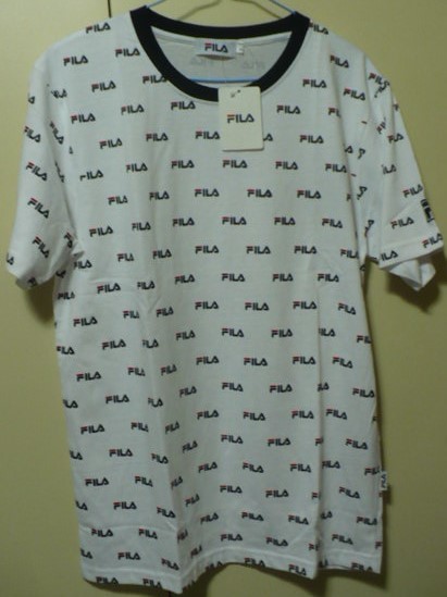 新品紙タグ付き未使用品 FILA(フィラ)製(無数メーカーロゴプリント柄丸首)半袖Tシャツ L 白×黒 FH7337