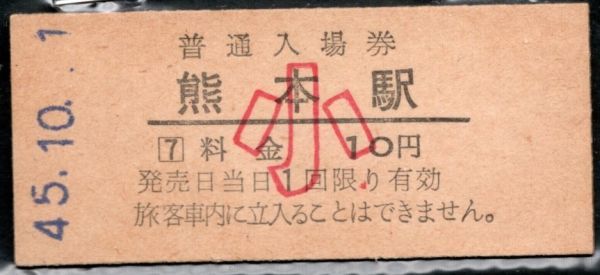 硬券入場券 熊本駅 (昭和)45.10.1 鹿児島本線