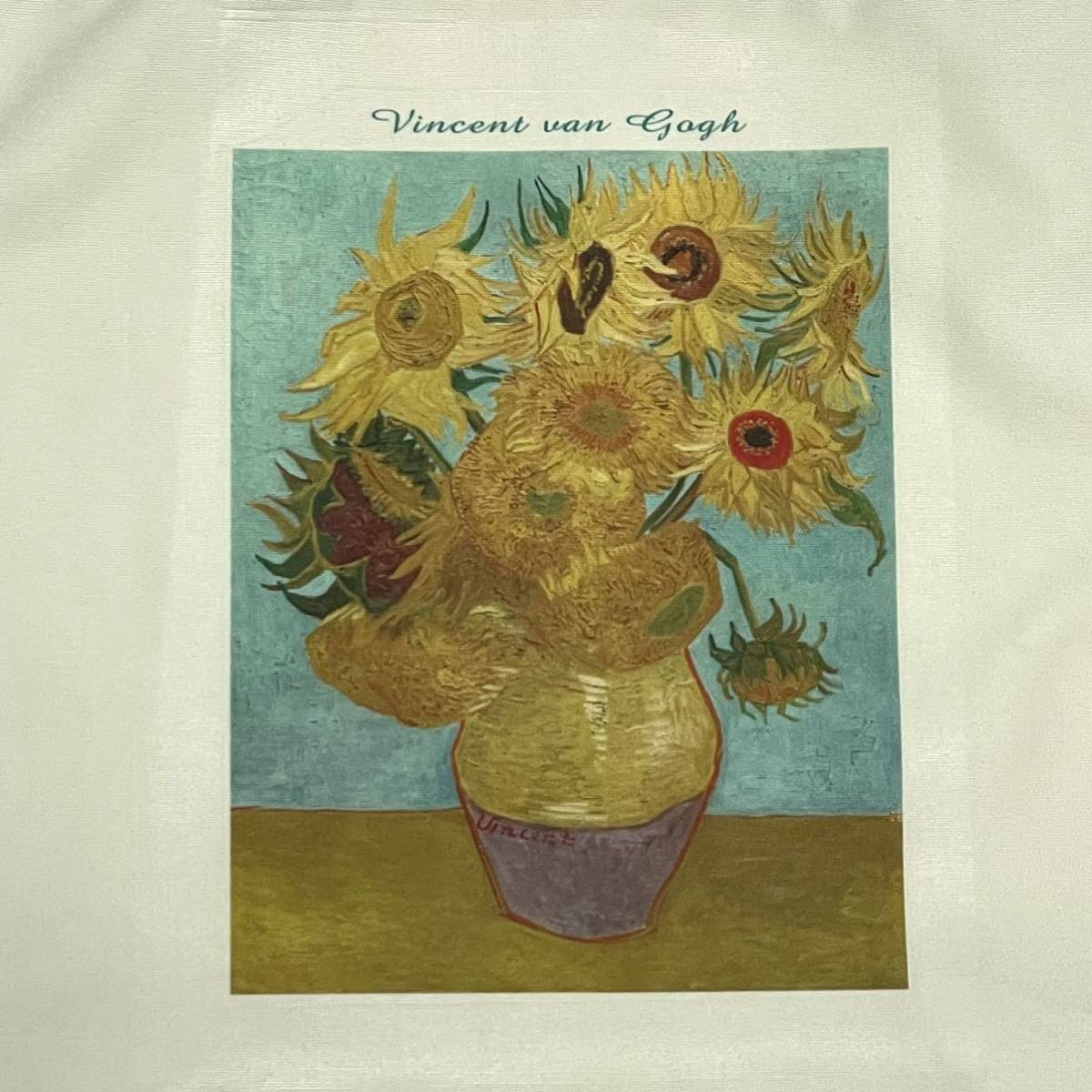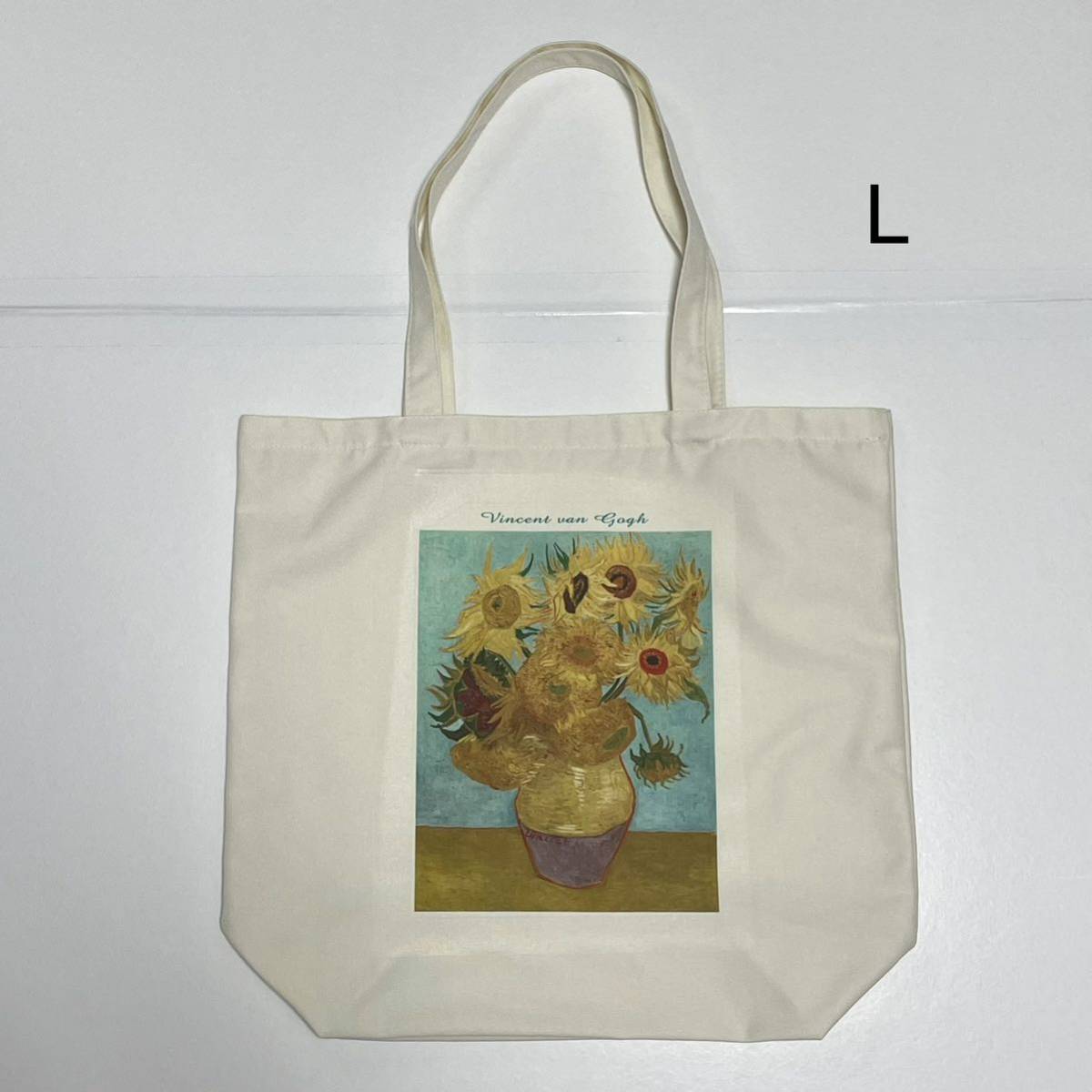 ゴッホのひまわり作品の中で、フィラデルフィア美術館に所蔵されている12本のひまわりの絵を美しくプリントした、水濡れに強い丈夫なポリキャンバス生地のトートバッグ、Lサイズです。