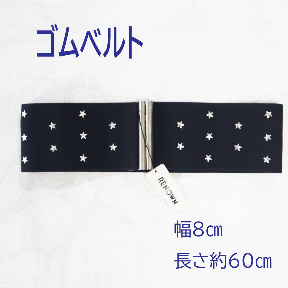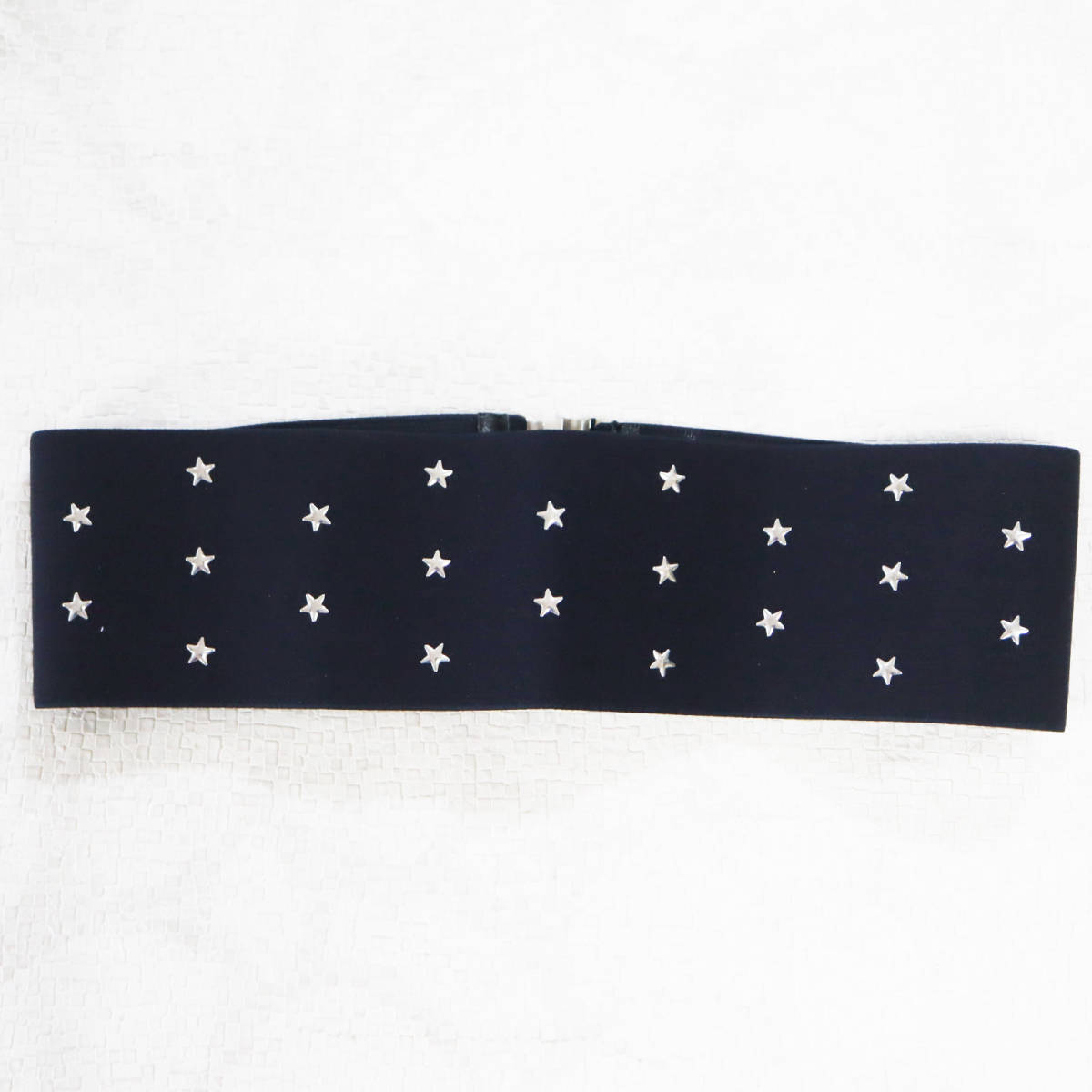 ゴムベルト ダンスベルト 幅8㎝ かみ合わせ式のベルトです。 黒いゴムの部分に星形シルバーのスパンコール 平置きの長さは60㎝です。 *メーカー希望小売価格(英抜き):¥@6000 *デッドストックです。 シルバーの金具の部分には曇りがあります。 落札の際は、その旨ご了承下さい。