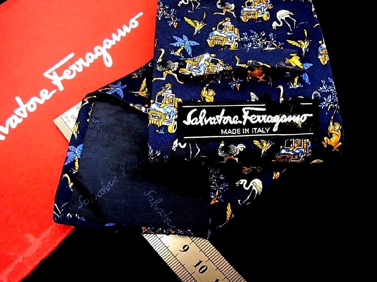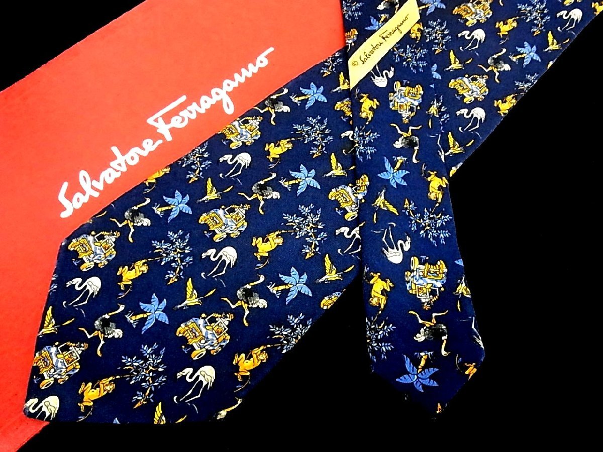 ★今週の特売★3553★高級ブランド【キャラ柄】★フェラガモ【ダチョウ サル 車 植物 柄】ネクタイ★