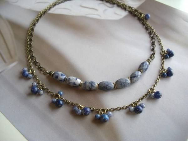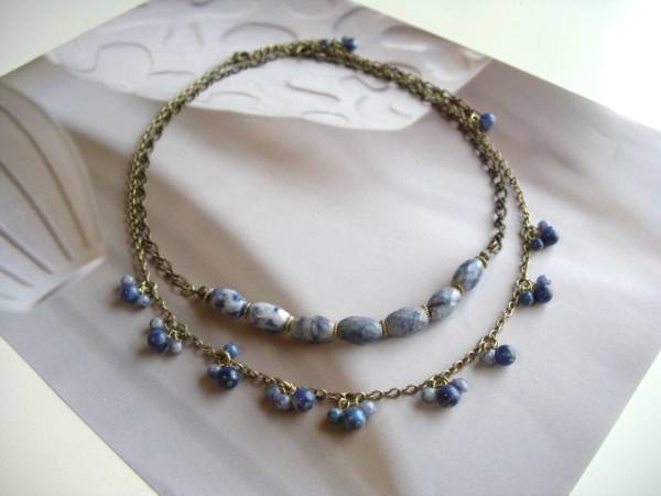 秋色・クローゼット・・シリーズです♪シックな藍色・・ナチュラルなデニムラピスのネックレス2点セットです♪重ねても単品でも楽しんでいただけます♪デニムラピスは藍色やグレー、群青色など様々な色がアートな表情です♪4ミリ、6ミリの丸玉のラピスはブーケのように繋いでいます♪長さは全長55センチ位で調節自由です♪15×8ミリ位のナツメカットのラピスはシックな座金やデザインチェーンを合わせました♪長さは全長55センチ位で調節自由です♪それぞれ単品やブレスレットも出品しています♪シンプルで飽きのこないいつまでも着けられるデザインを考えて作りました!ハンドメイドをご理解頂いてノークレーム、ノーリターンでお願いします