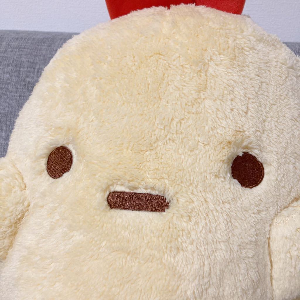 すみっコの名脇役、えびふらいのしっぽがバンザイをしたポーズのとても可愛いぬいぐるみです。