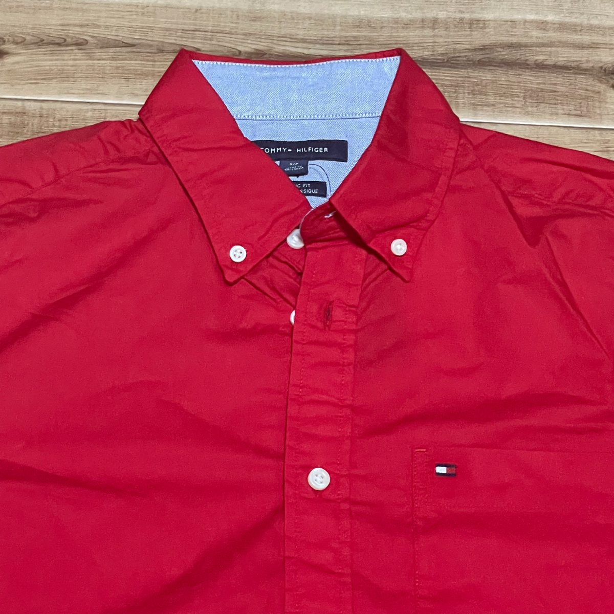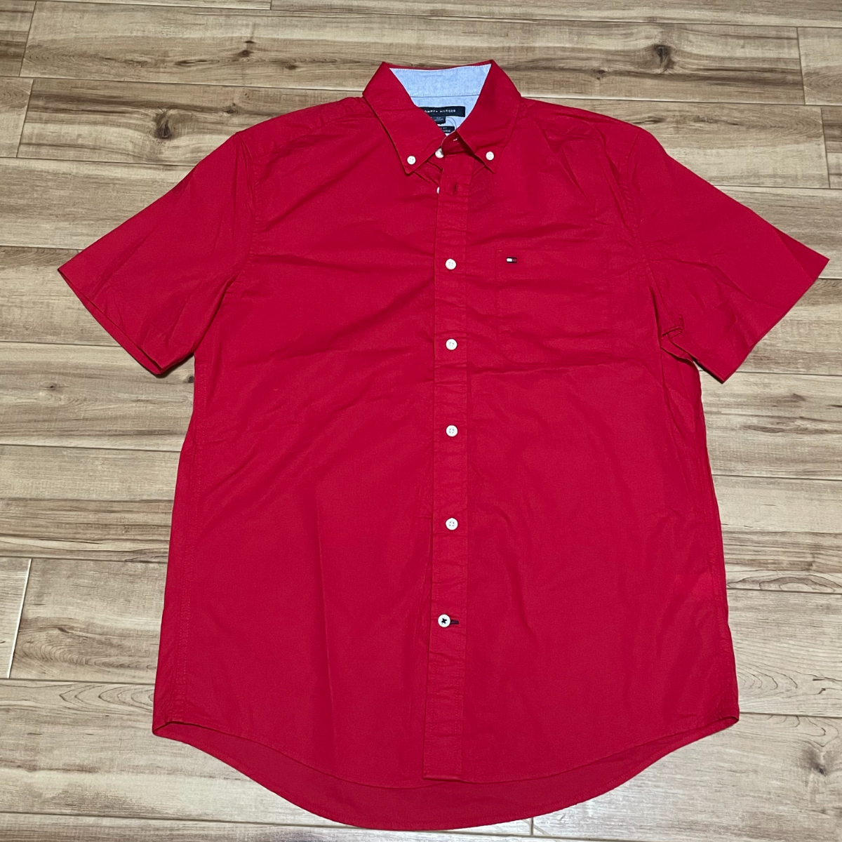 USA正規品 【S】 TOMMY HILFIGER トミーヒルフィガー 半袖 ボタンダウンシャツ 赤 クラシックフィット 刺繍フラッグロゴ 胸ポケットあり