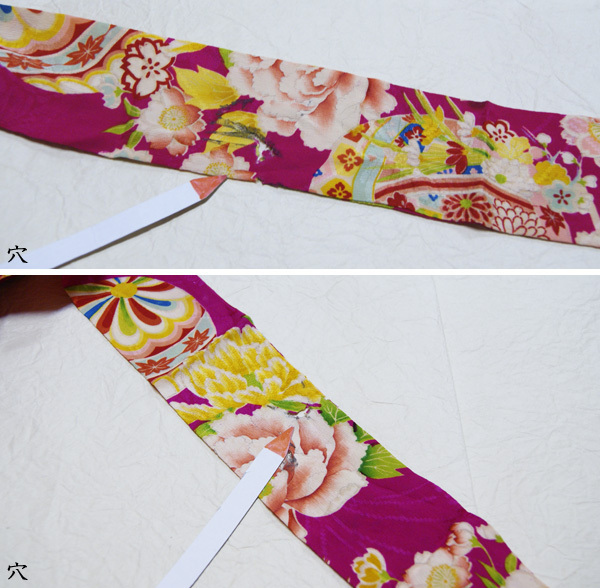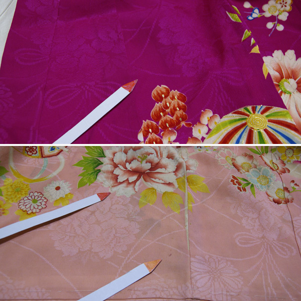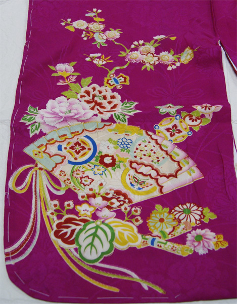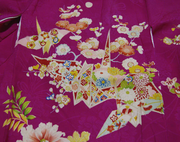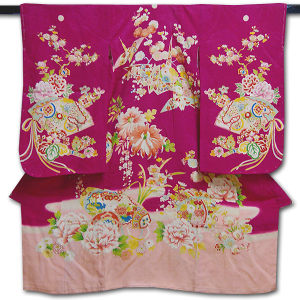ひのき屋★アンティーク/昭和★女の子の祝着/ローズピンク,裾ぼかし/四季の花々,桧扇,折鶴★レトロ,古布,リメイク素材★3491B 中古