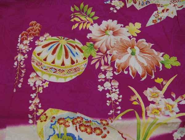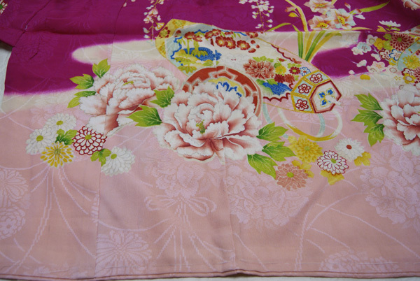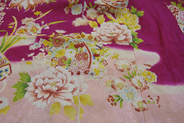 ローズピンクとピンクの裾ボカシに牡丹・桜・梅・菊・桧扇・宝尽くし模様。