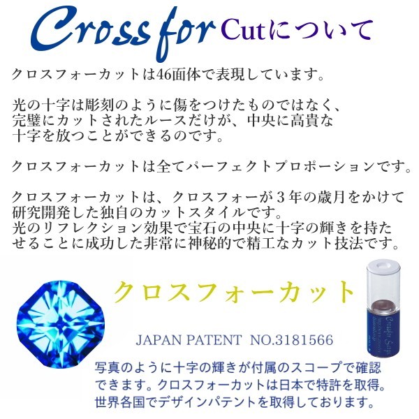 クロスフォーカットとは、3年間の歳月をかけて研究開発を繰り返し、光のリフレクション効果で宝石の中に十字の輝きをもたせたカットです。そのクロスの輝きは、付属の専用スコープでご覧いただけます。