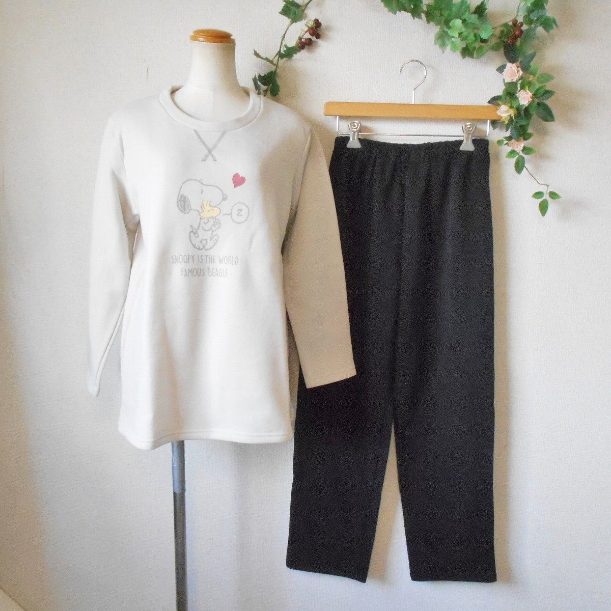 【ポイント】株)グレイス、ピーナッツのレディース用上下セットになります。お色はトップスが薄いベージュ系ベースでパンツは黒色になります。秋冬中心のルームウエアで、とっても可愛いセットです。