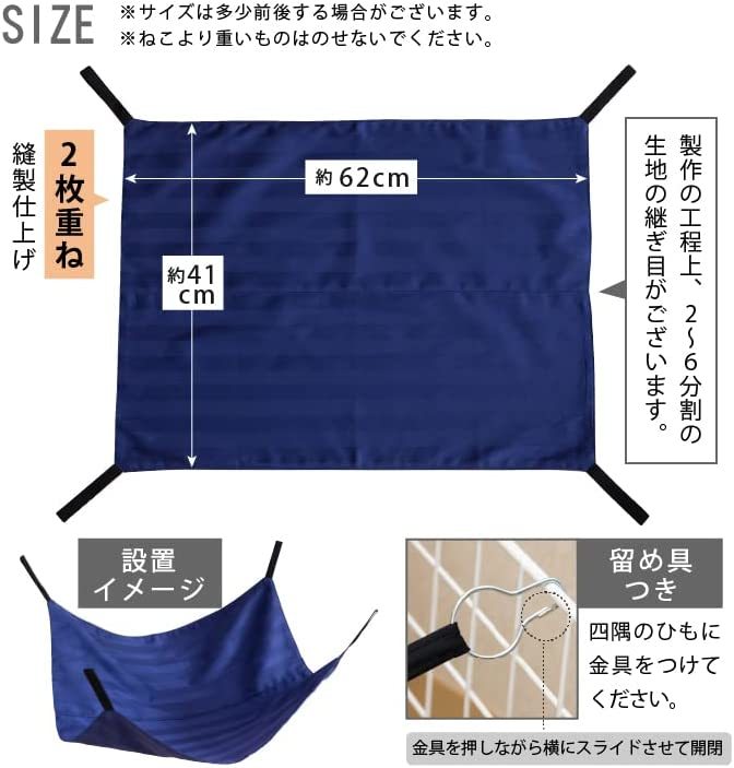 猫用 ハンモック (62×41cm) 選べるカラー 金具付き (雅:ネイビー) 洗える ケージ用 吊り下げ 耐荷重 8kg 猫ハンモック ペットベット
