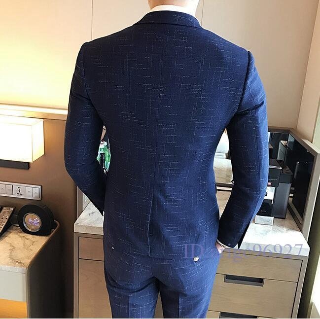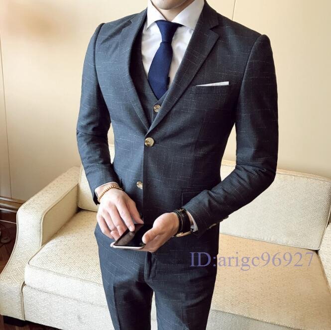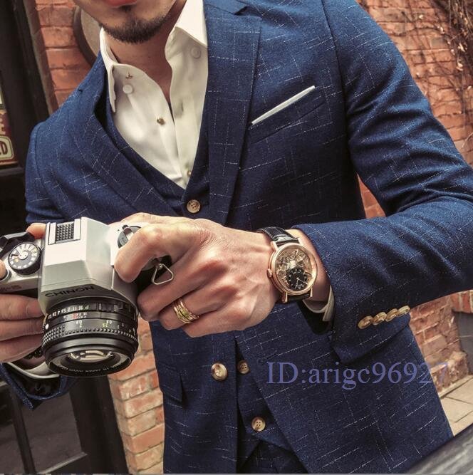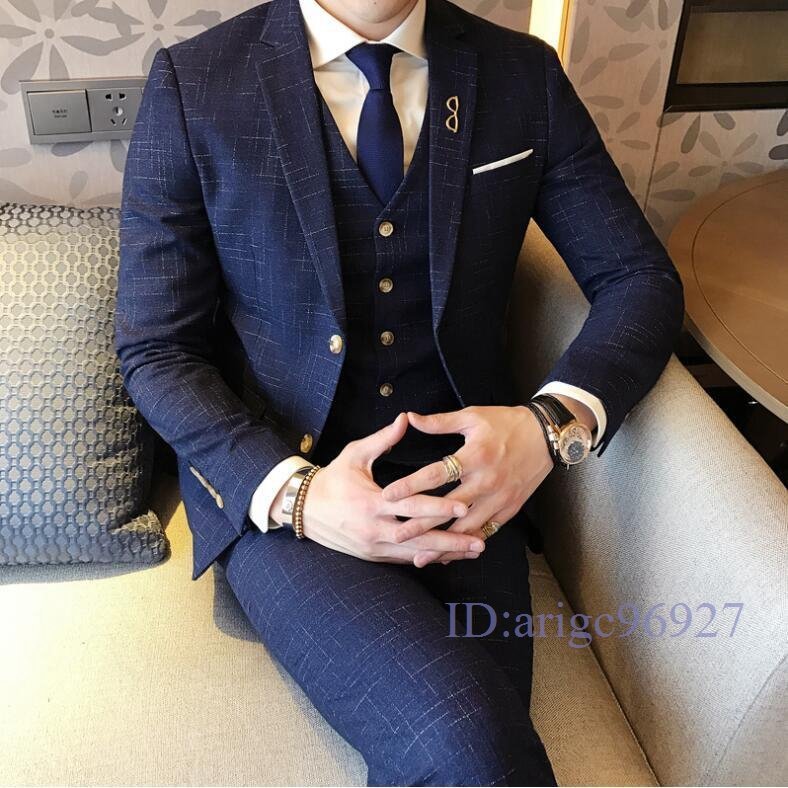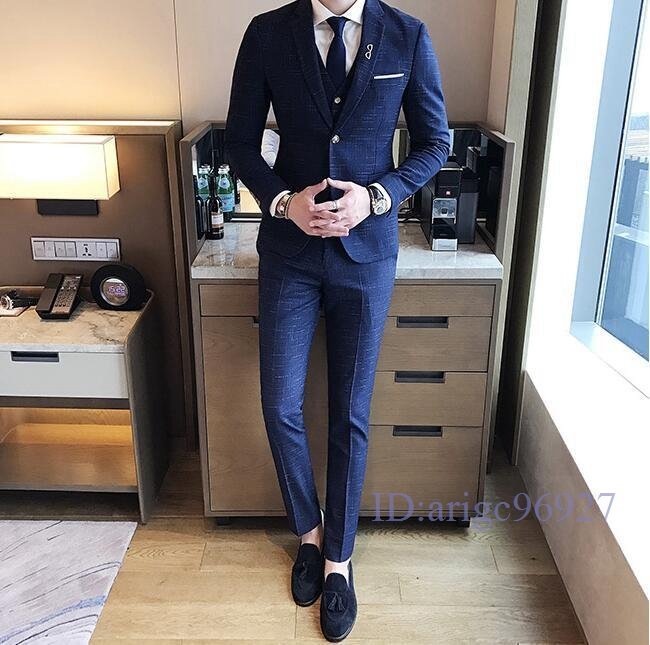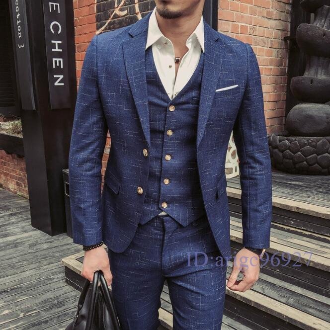 R091☆新品スーツ メンズ スリーピースビジネススーツ セットアップ 3ピーススーツ カジュアルスーツ チェック柄洗える通勤結婚式 ブルー