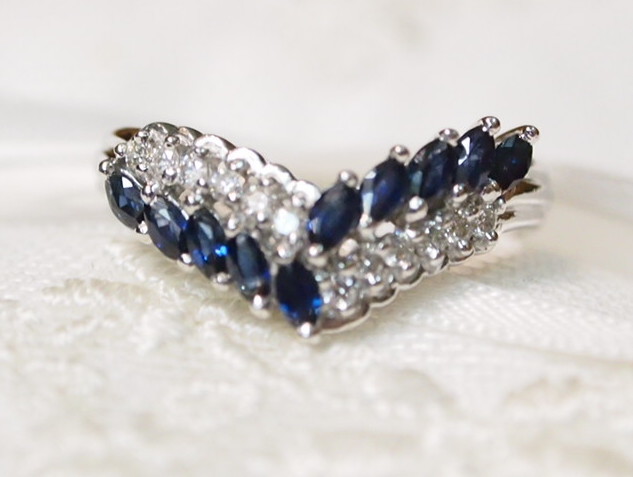 サファイアとダイヤは交互に並べられ、マーキスカットがご施されているサファイアを使用しているので、シンプルなV字シルエットですが個性的でオシャレな雰囲気。