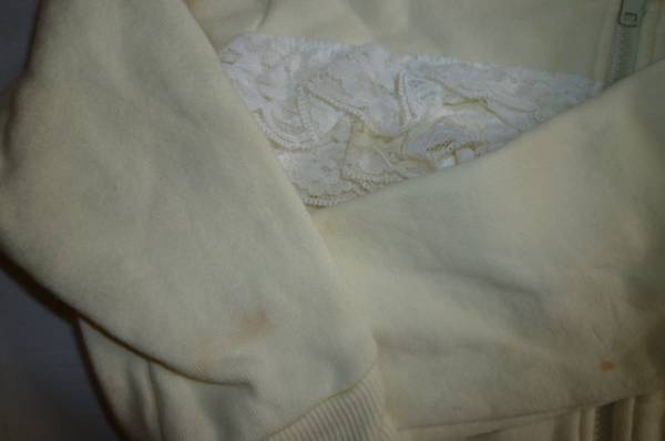 ご覧頂きありがとうございます。1回使用、レースに薄いシミあり そでに シミあり。着たらわかりにくいです。画像見てください。素材はきれいです。クリーム色。店頭のような完璧な商品をお求めの方はご遠慮して下さい。ノークレームでお願いいたします。保障はありませんが定形外500円で配送できます。。綿100