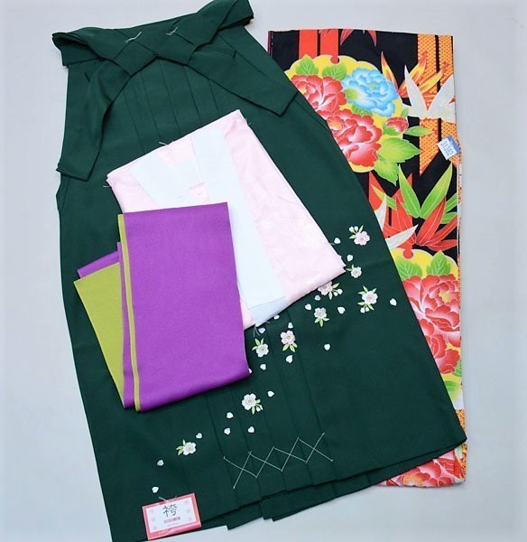項目 | 着物袴フルセット(適合身長:約144cm~150cm ジュニア用へお仕立て直し致します。) ・二尺袖着物 ・二尺袖長襦袢(半襟付き) ・袴 ・袴下帯(浴衣帯にも使用できます。) |