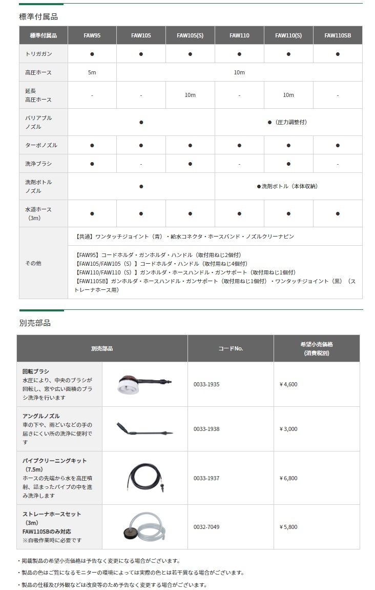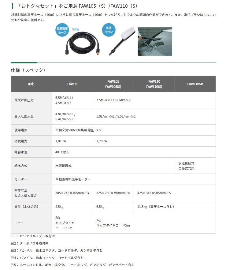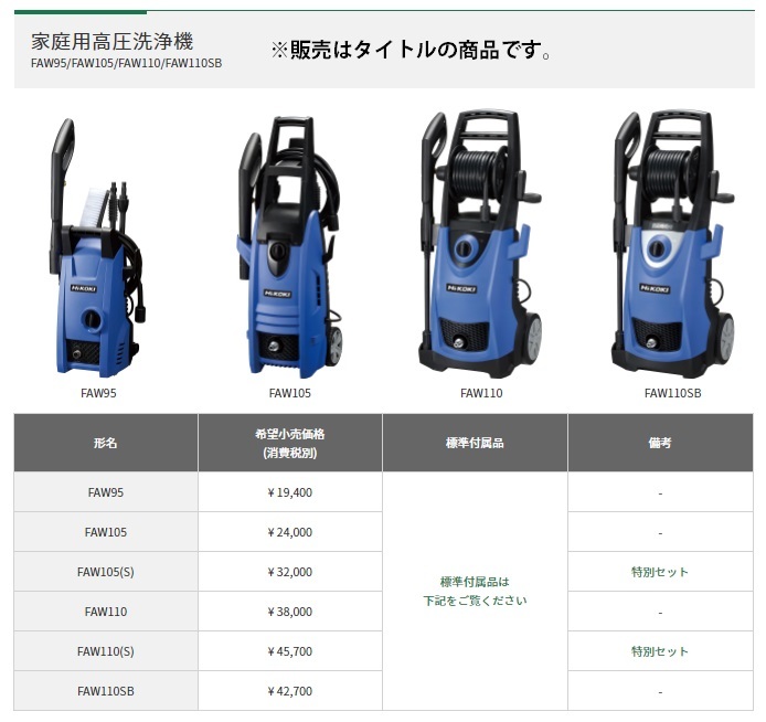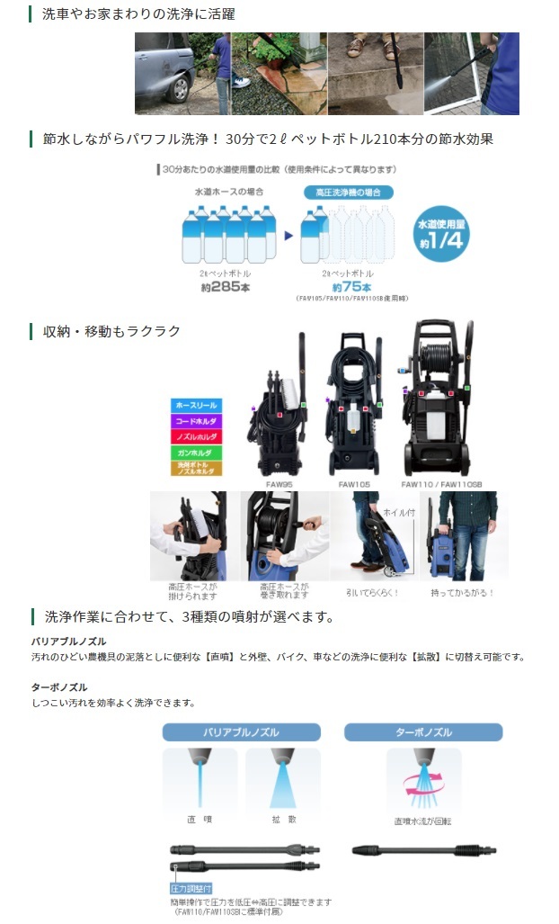 HiKOKI ハイコーキ(旧日立工機)家庭用高圧洗浄機FAW110SB■洗車やお家まわりの洗浄に活躍■節水しながらパワフル洗浄! 30分で2Lペットボトル210本分の節水効果■収納・移動もラクラク■洗浄作業に合わせて、3種類の噴射が選べます。・バリアブルノズル 汚れのひどい農機具の泥落としに便利な【直噴】と外壁、バイク、車などの洗浄に便利な【拡散】に切替え可能です。・ターボノズル しつこい汚れを効率よく洗浄できます。