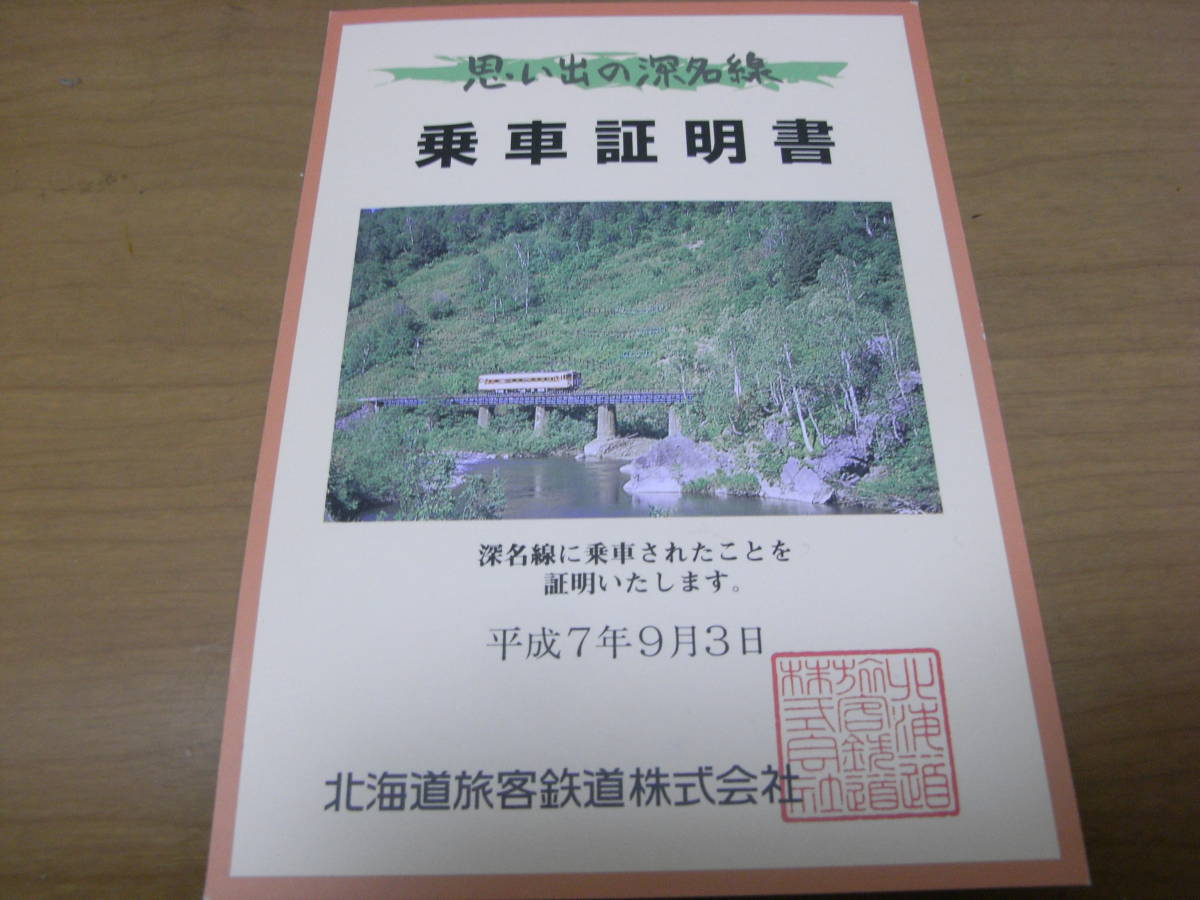 思い出の深名線 乗車証明書 平成7年9月3日 北海道旅客鉄道株式会社