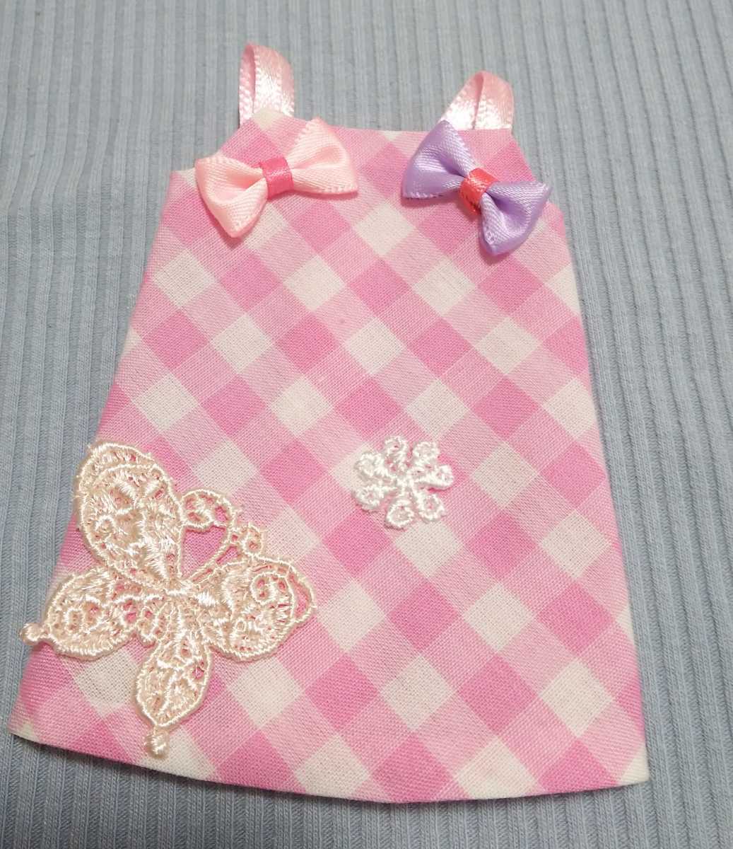 ピンクチェックの生地で、肩ひもは、リボンテープです♪