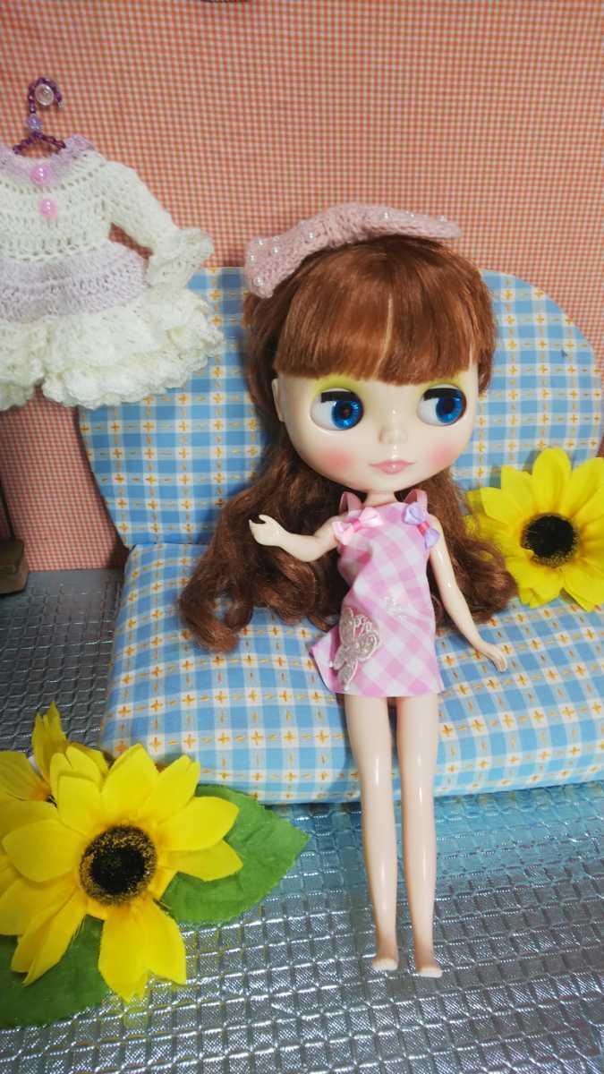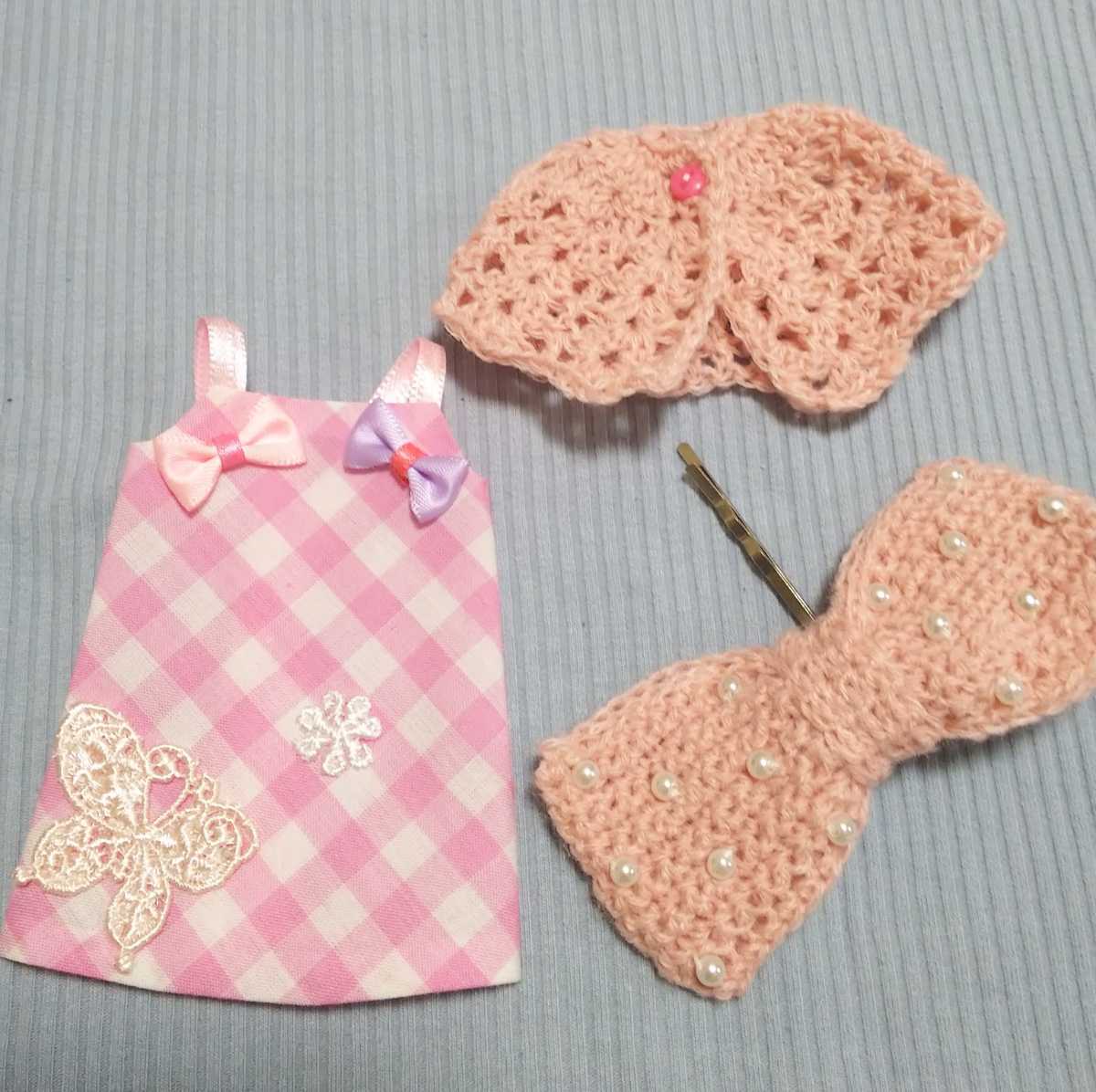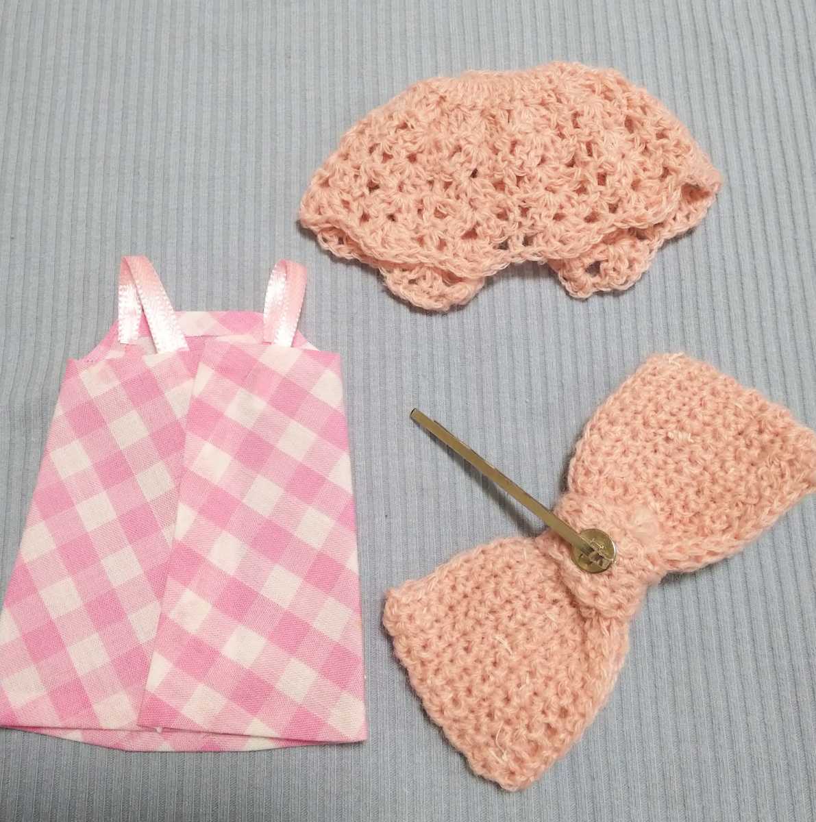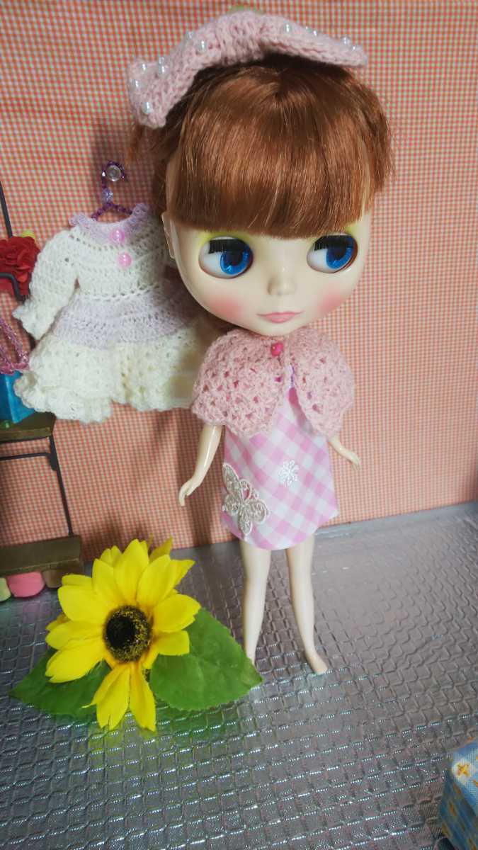 こちらは、ブライスちゃんに 手作り手編みワンピース、ケープ、ヘアアクセの合計3点セットです。