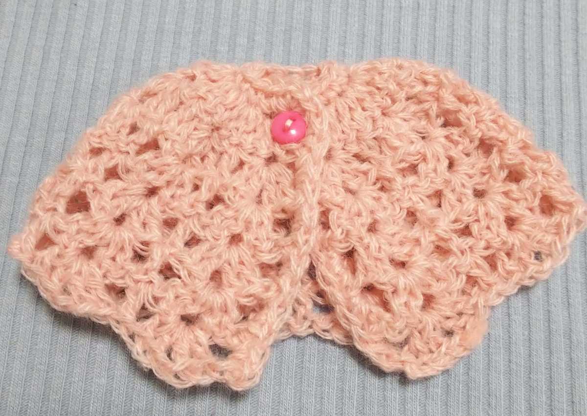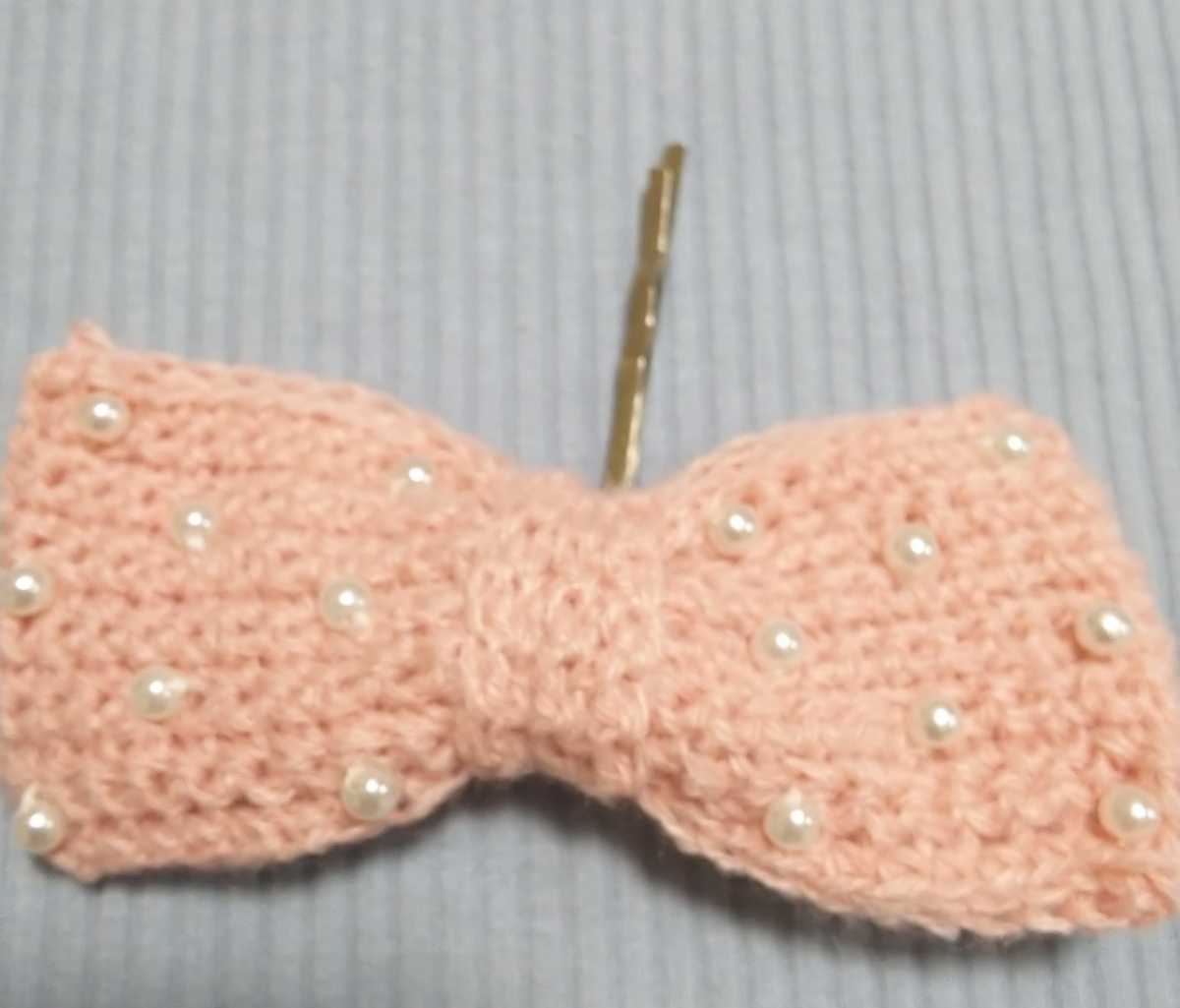 ケープとお揃いのお色で、リボンを編みました♪パール風ビーズを縫い付けて、可愛く仕上がりました♪