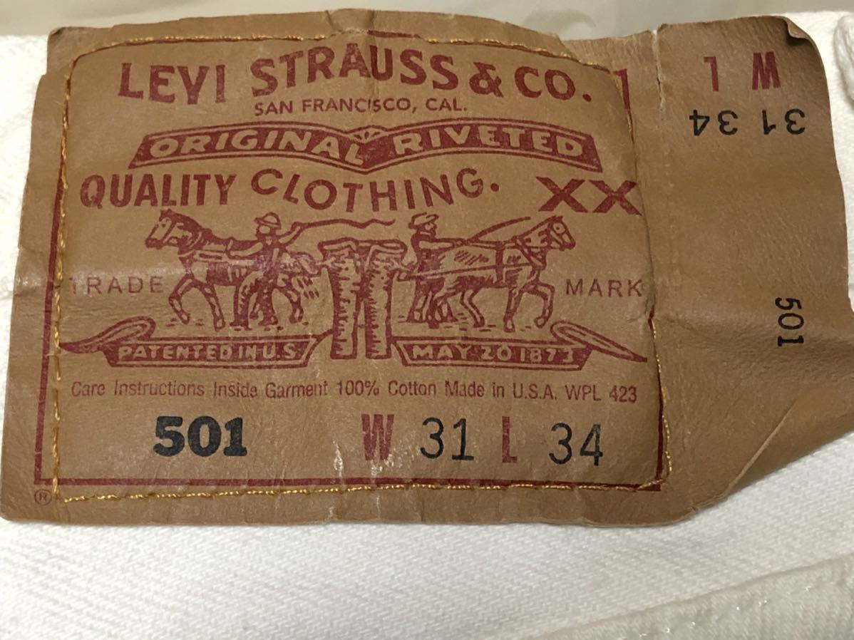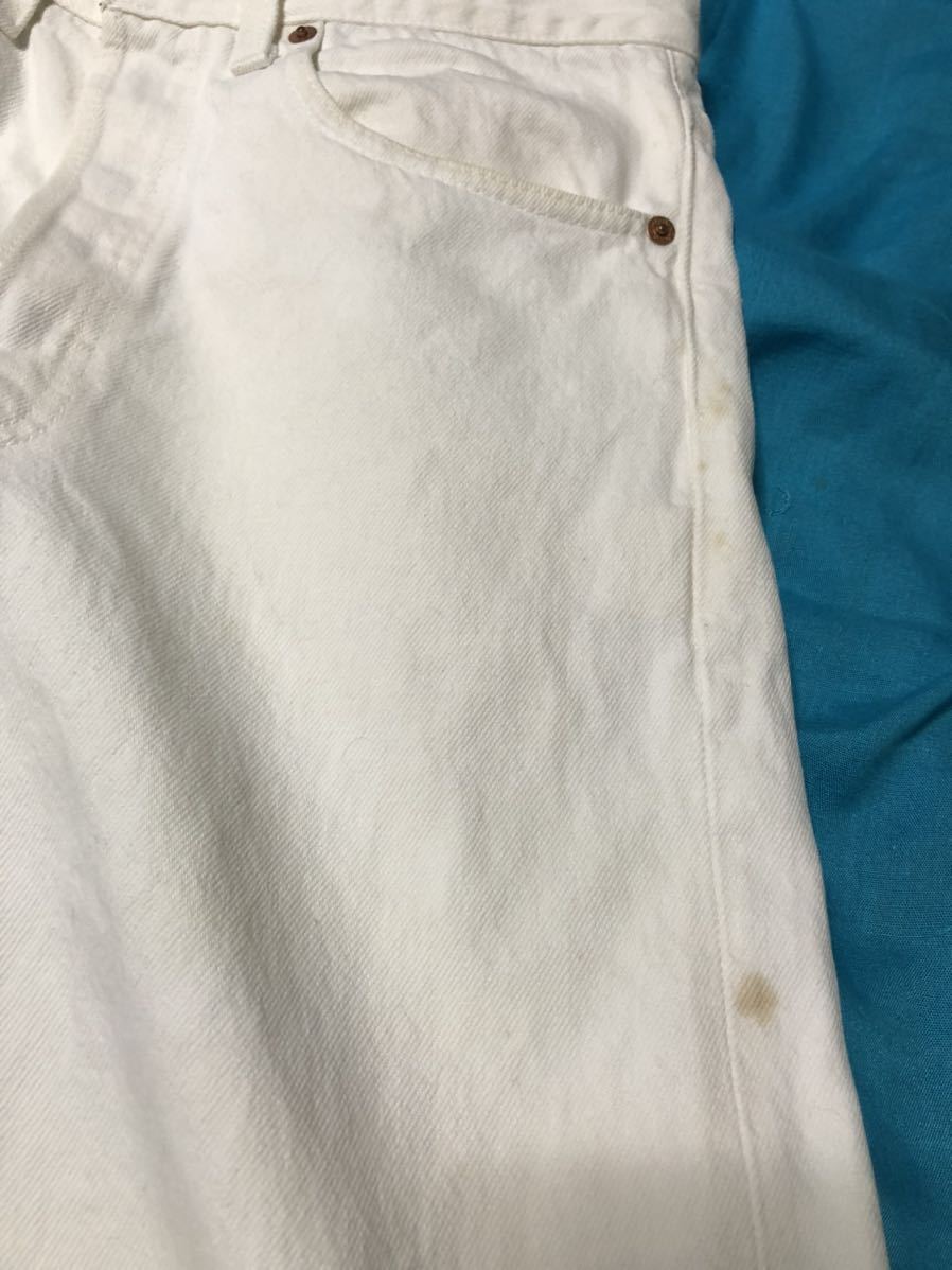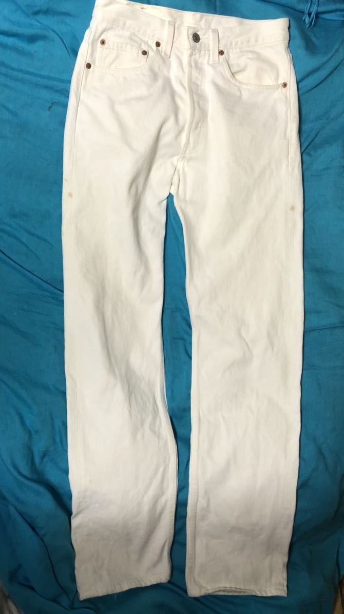 1990年代初め頃のアメリカ製、LEVI'S#501、ホワイトジーンズです。サイズは31×34表記。実寸はウエスト約77センチ、総丈約110.5センチ、股下約84センチ、腿幅約28センチ、すそ幅約20センチです。所々、薄いシミが点在しますが、洗濯と漂白で徐々に解消できる程度かと思います。今や貴重なアメリカ製LEVI'S!しかも当時のフラッシャーもお付けします!90年代製といえども、既に30年近く経過しており、ネクストヴィンテージの候補になりうるアイテム、XX並に価値が上がる前に入手を!