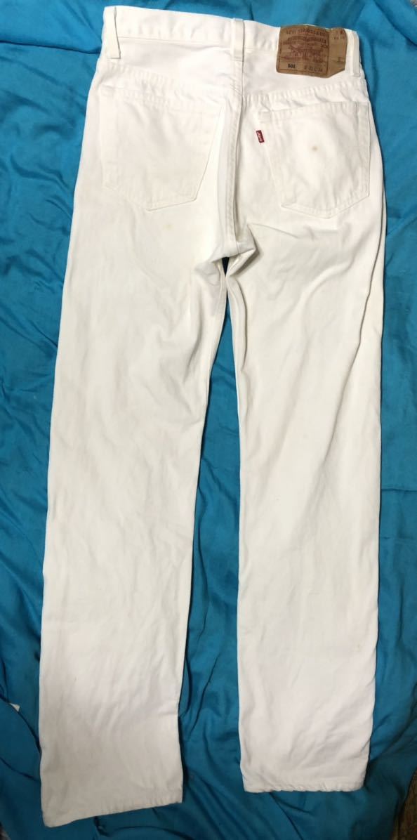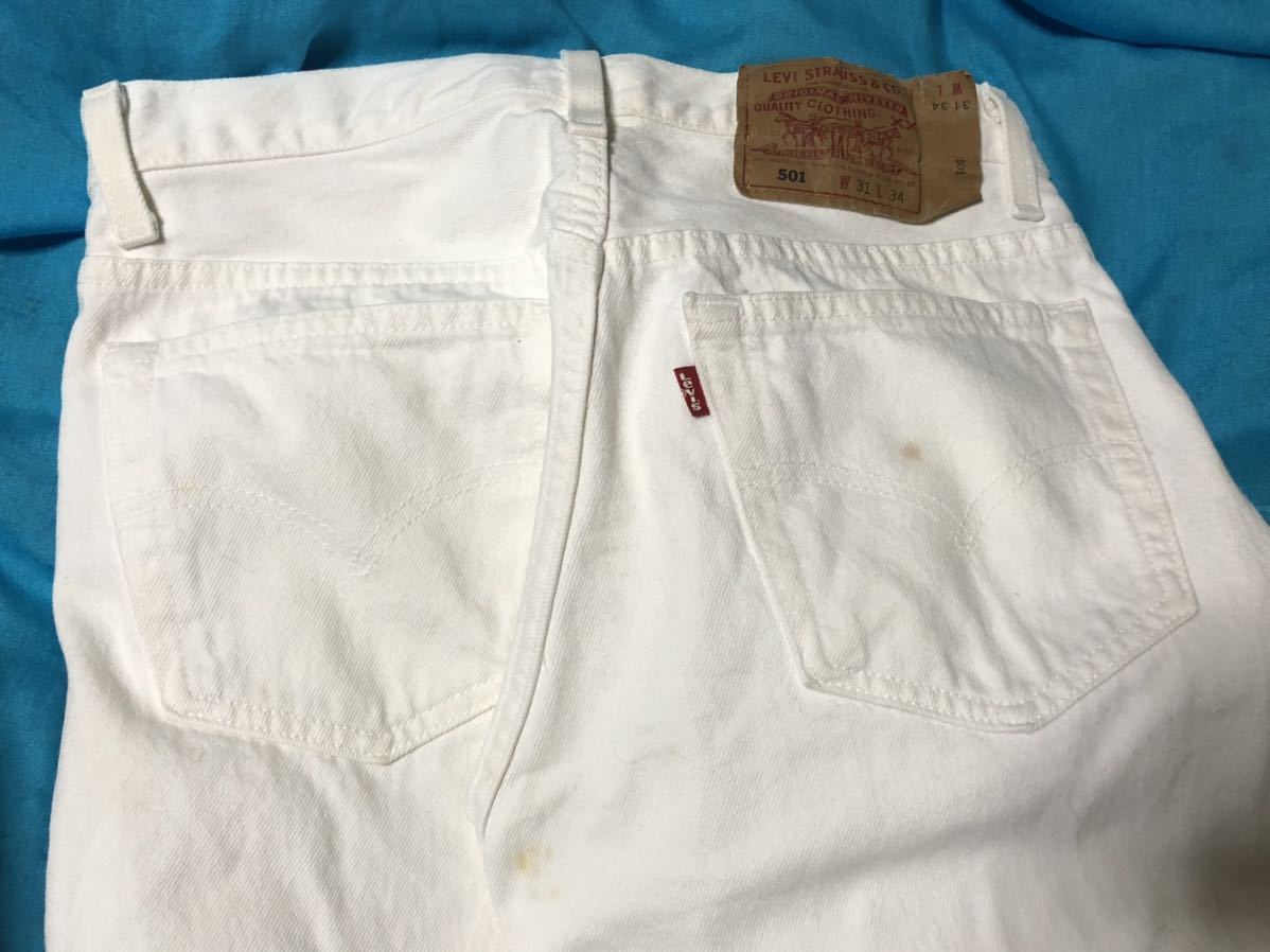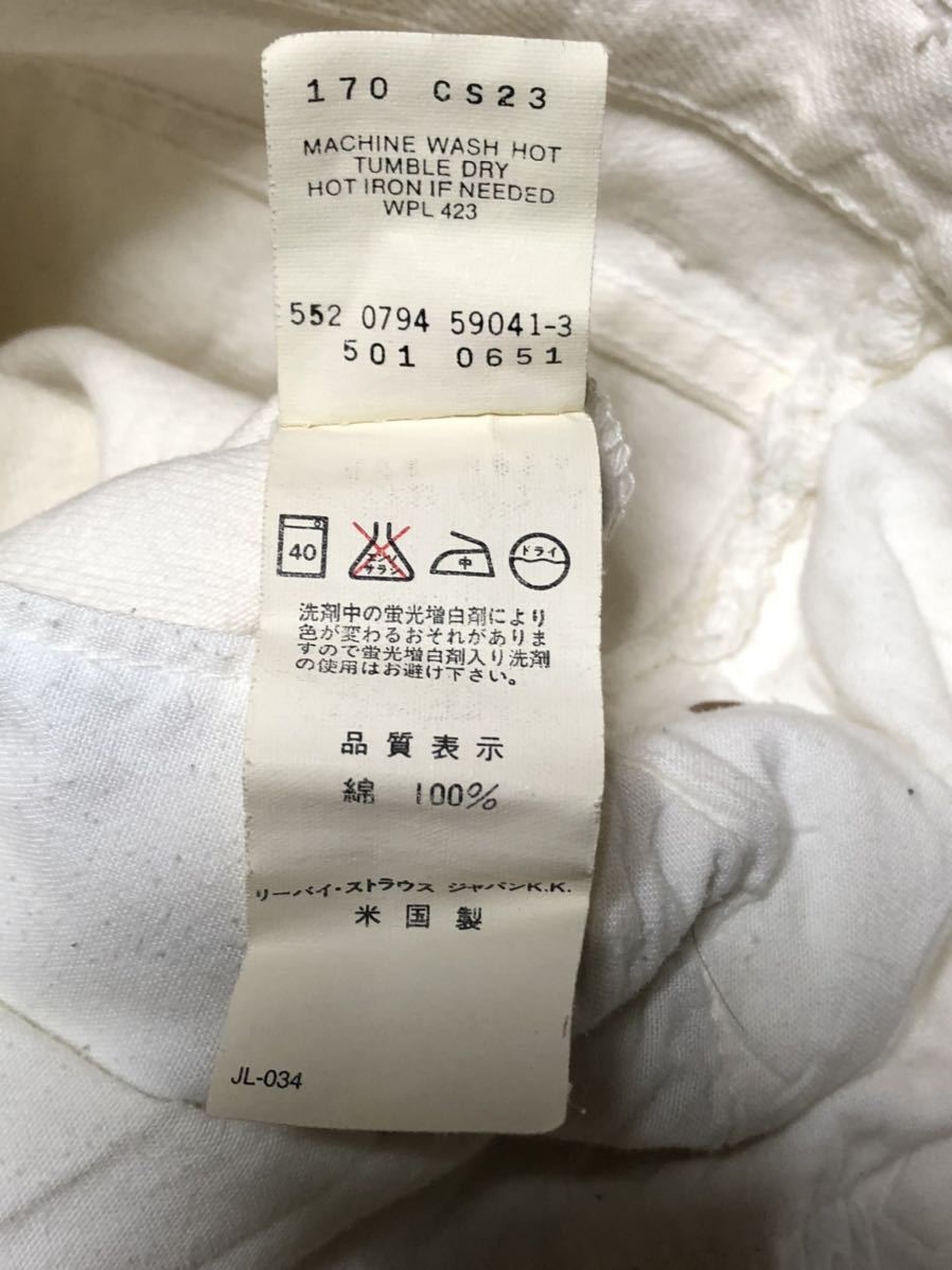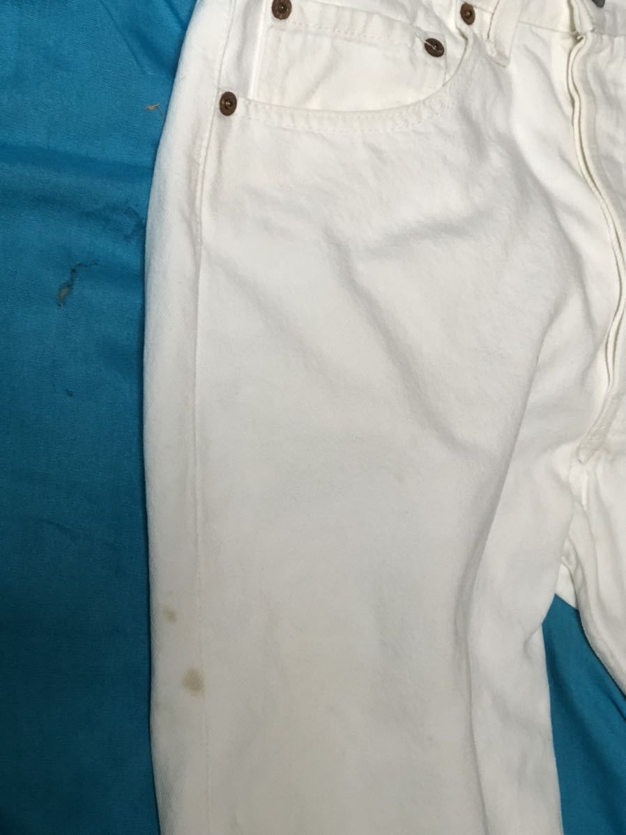 1990年代初め頃のアメリカ製、LEVI'S#501、ホワイトジーンズです。サイズは31×34表記。実寸はウエスト約77センチ、総丈約110.5センチ、股下約84センチ、腿幅約28センチ、すそ幅約20センチです。所々、薄いシミが点在しますが、洗濯と漂白で徐々に解消できる程度かと思います。今や貴重なアメリカ製LEVI'S!しかも当時のフラッシャーもお付けします!90年代製といえども、既に30年近く経過しており、ネクストヴィンテージの候補になりうるアイテム、XX並に価値が上がる前に入手を!