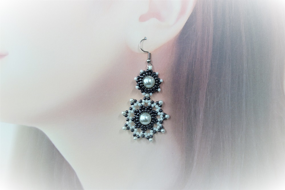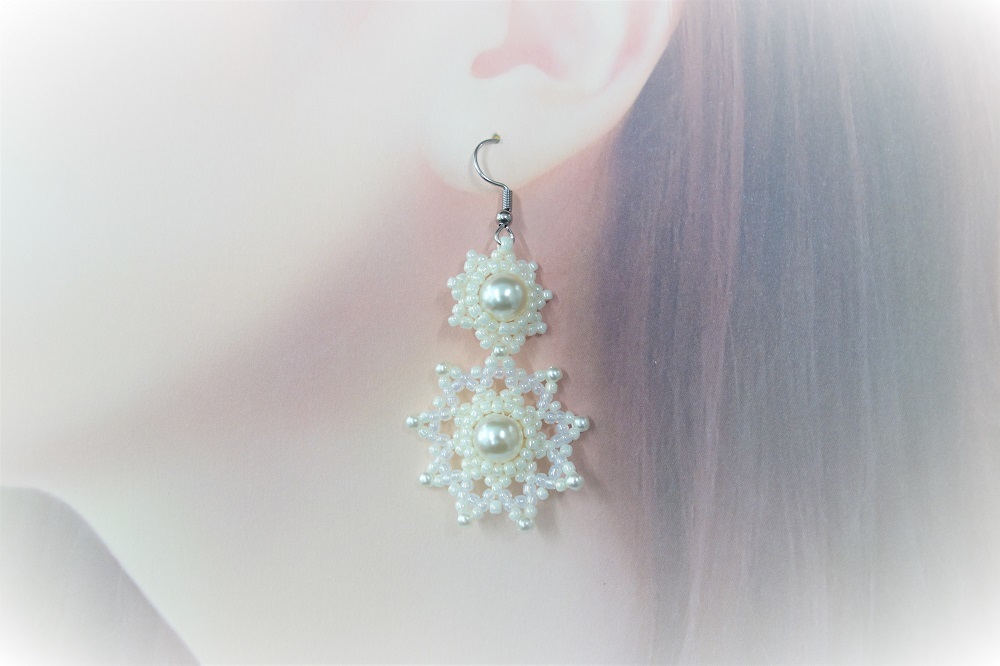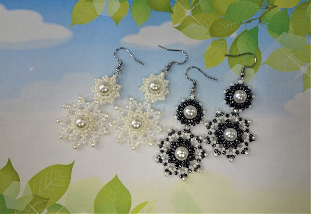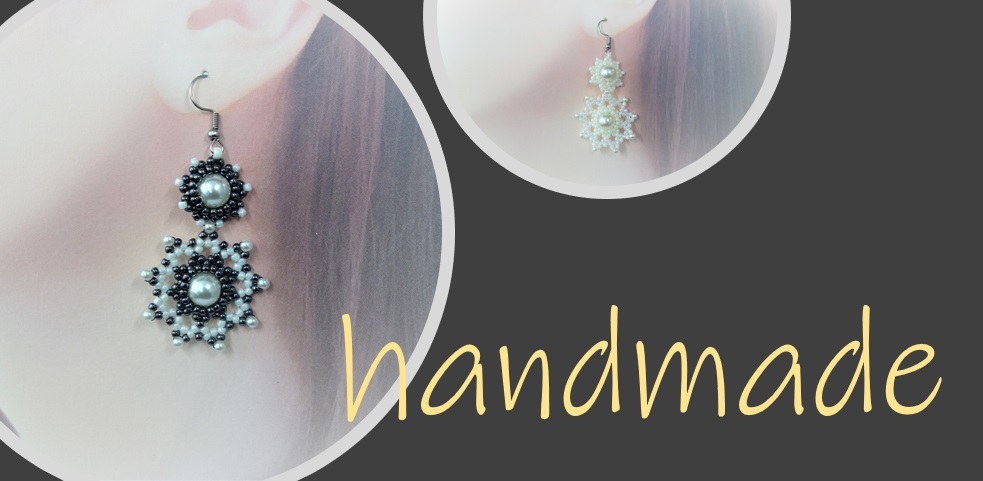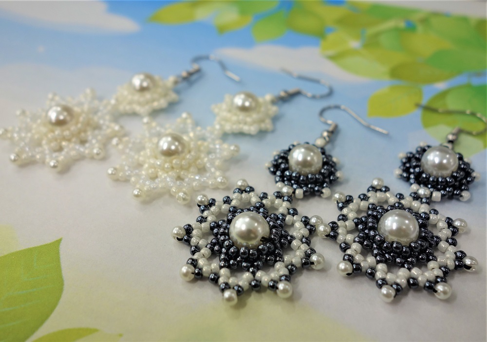 ◎主な使用材料:TOHOビーズ、プラスチック製パール調ビーズ、ステンレス製ピアス金具、MIYUKIビーズ用糸などを使用しています。