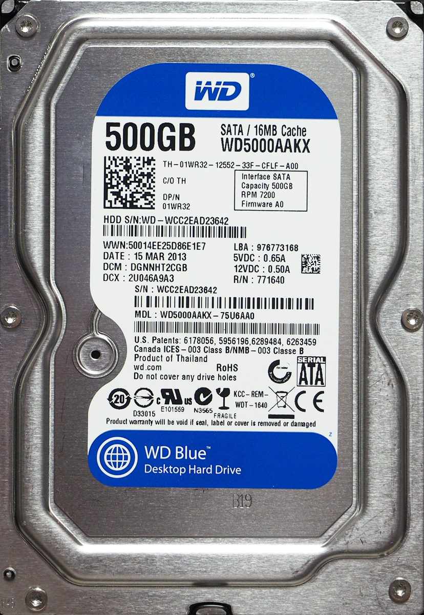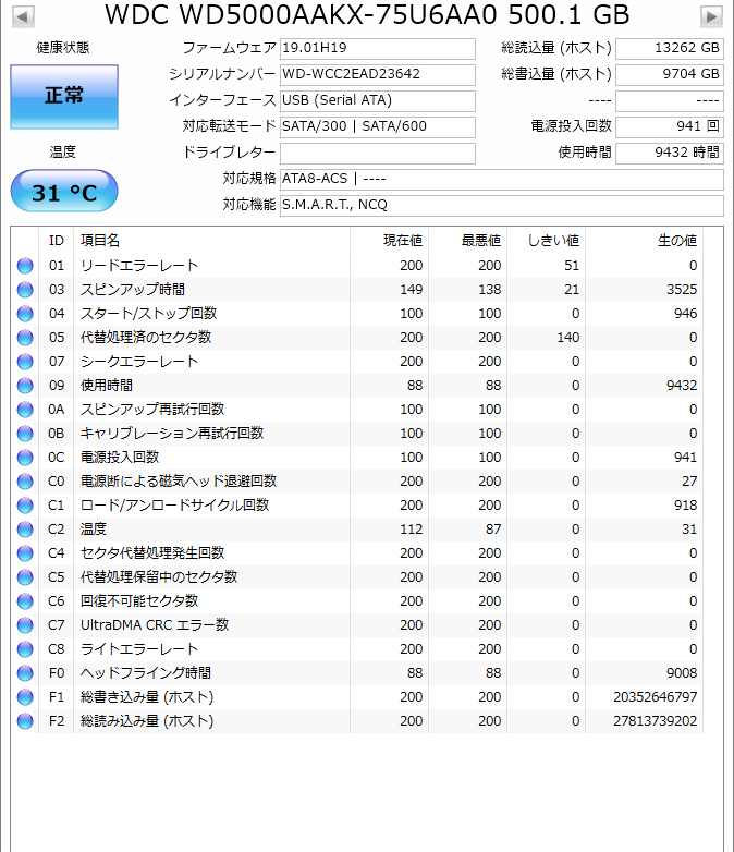 Western Digital WD5000AAKX-75U6AA0 DP/N 01WR32 3.5インチ SATA600 500GB 941回 9432時間