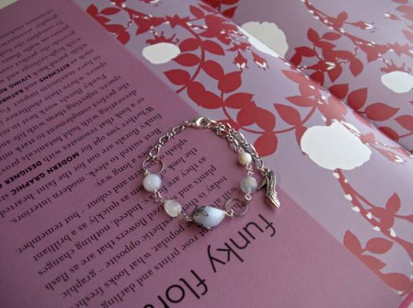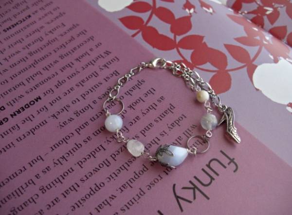 オリエンタル・ガール・・シリーズです♪可憐な水色・・繊細なブルーレースのブレスレットです♪儚げな水色のブルーレースに神秘的なムーンストーンや小鳥さんのチャームを合わせてロマンチックな表情です♪6ミリ、8ミリの丸玉や10×12ミリのラフカットのブルーレースにタンブルカットのムーンストーンやデザインリングを合わせました♪長さは全長23センチ位で調節自由です♪お揃いのブレスレットやネックレスやピアスも出品しています♪シンプルで飽きのこないいつまでも着けられるデザインを考えて作りました!ハンドメイドをご理解頂いてノークレーム、ノーリターンでお願いします