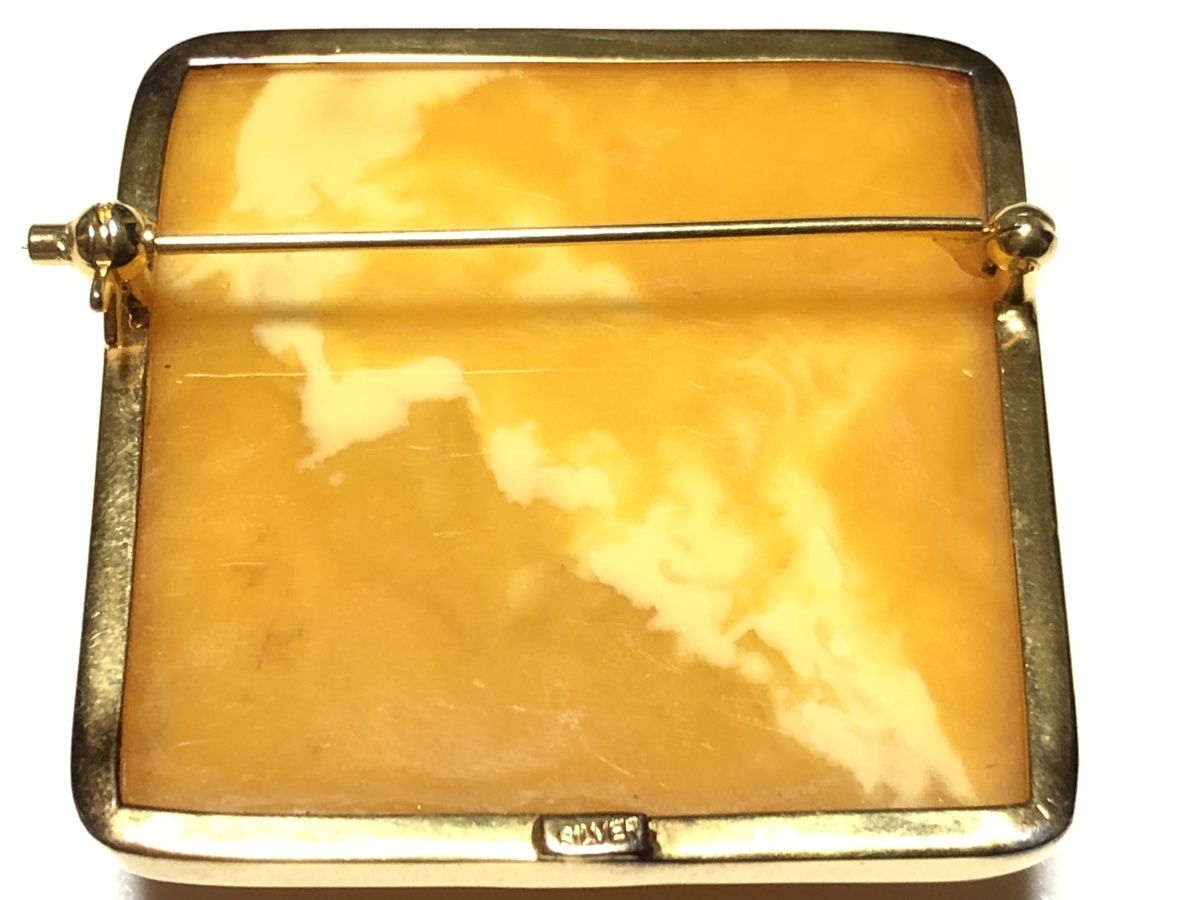 ロイヤルアンバー、SILVERを使用した、デザインスクエアカットのブローチです。金具部分にはSILVERの刻印があります。