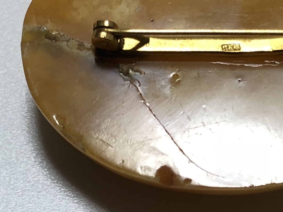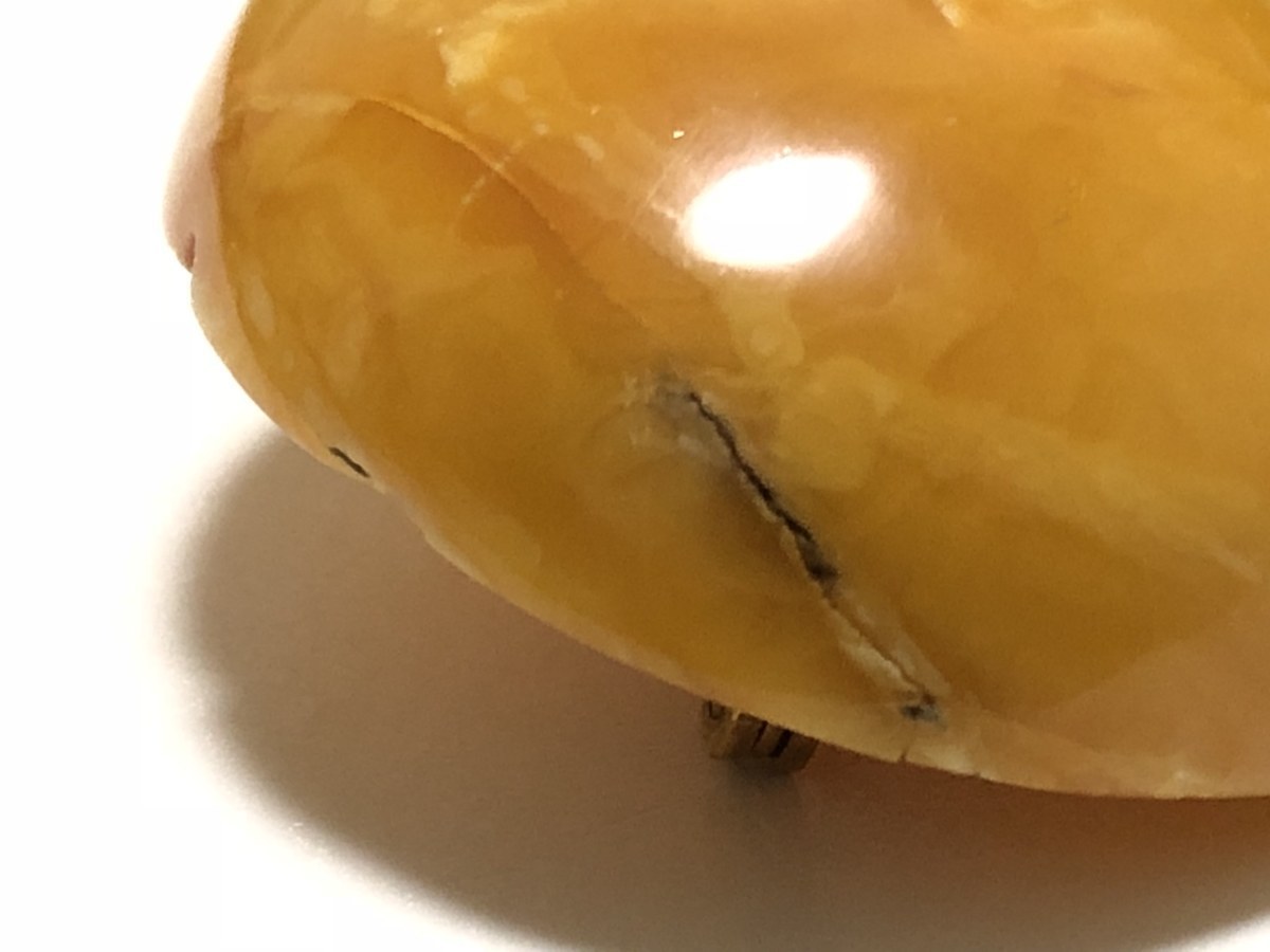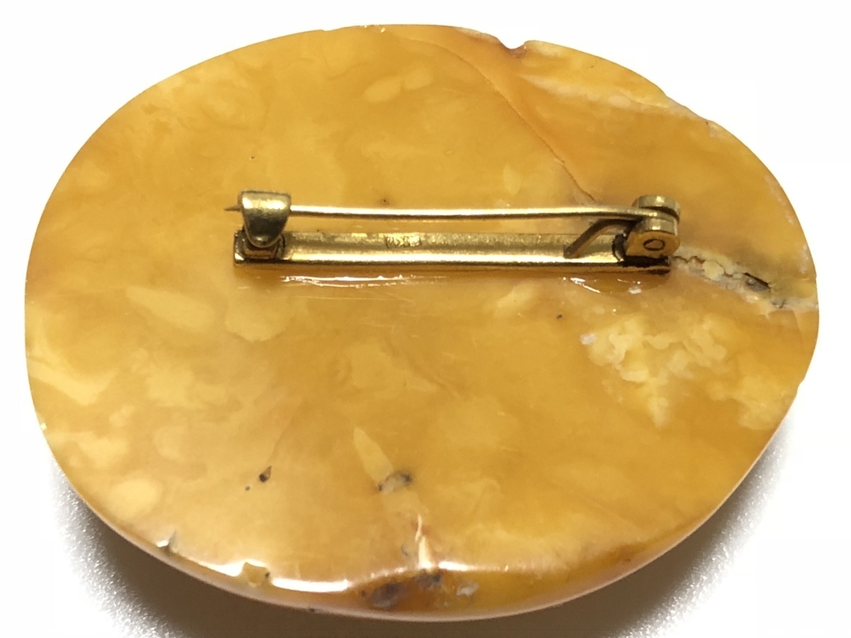 ロイヤルアンバーを使用した、オーバルカットのブローチです。1ヵ所、ヒビが入っています。完全に割れてはいませんが、もろくなっていると思われますので、【難あり】表示です。
