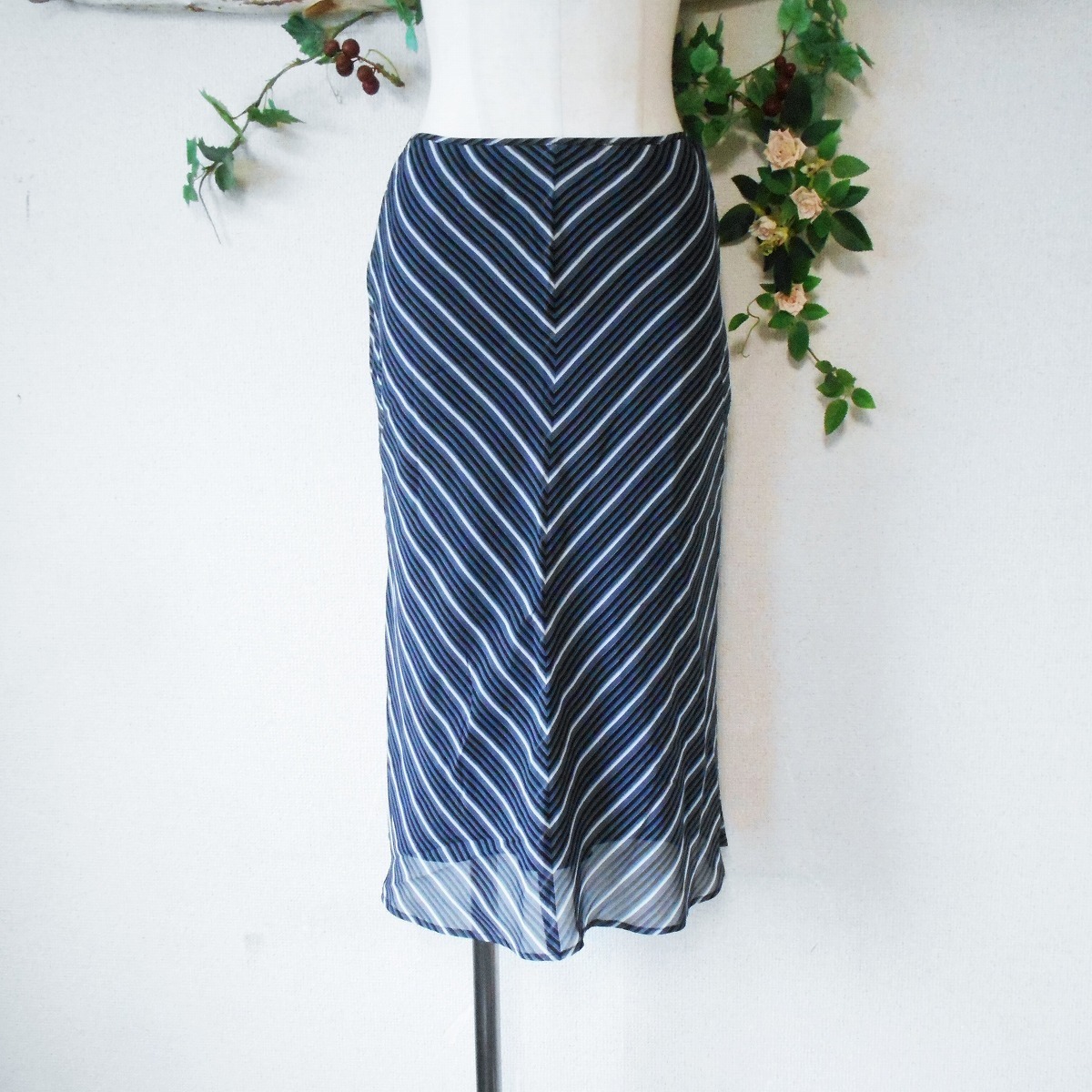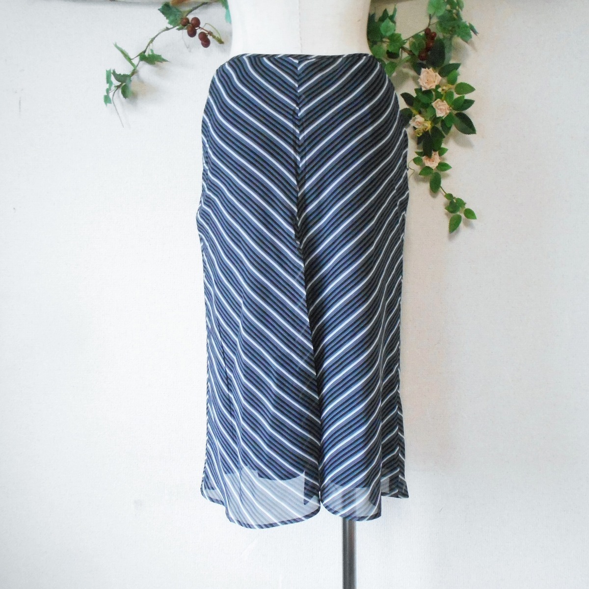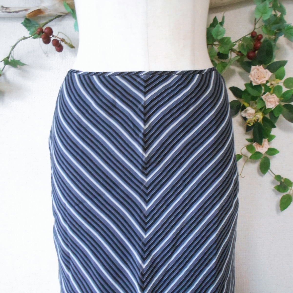 【ポイント】コムサデモードのスカートになります。お色は黒やグレー、白色のラインが斜めに入っていて、シルク100%の春夏を中心に着ていただけるお品です。使いやすいミモレ丈くらいのとっても素敵な一着です。