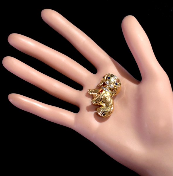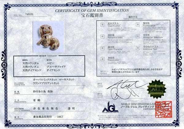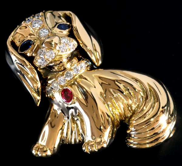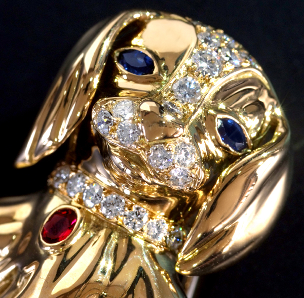 重量14.8g 幅27.8×29.3mm 愛らしいワンコにヴァンクリーフアーペルならではの上質なダイヤモンド、サファイア、ルビーをセットしたとても優美なブローチでございます。名門ジュエラーならではの美しさ、気品が漂っております。ノーブルジェムグレイディングラボラトリーの鑑別書付。新品仕上げ済。石目表示はございません。