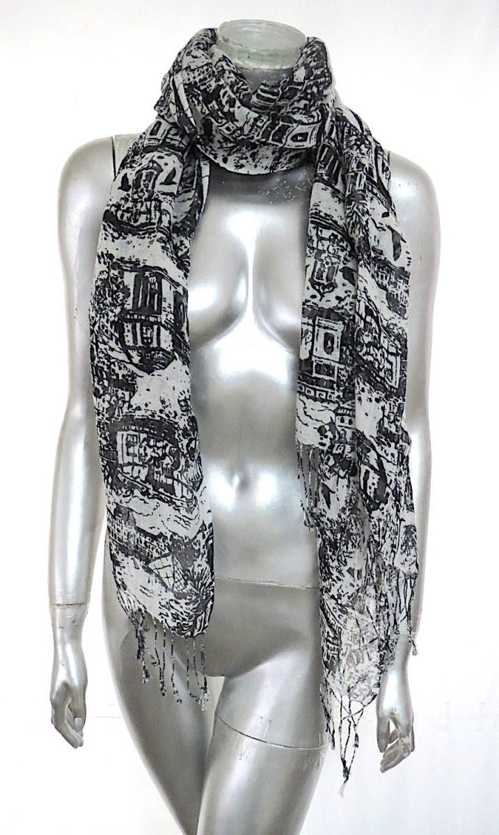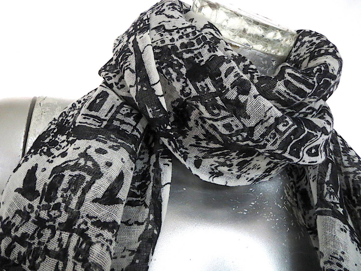二点以上で送料無料! L80 LOSICARIE ロシカリエ 未使用 ストール ショール 麻 リネン 綿 コットン混 ブラック 黒 ホワイト 白 柄