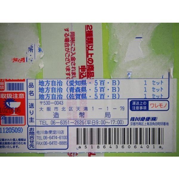| 【874】地方自治60周年記念 500円バイカラークラッド貨幣 愛知県 青森県 佐賀県 B 切手付 各1個 計3個 | |