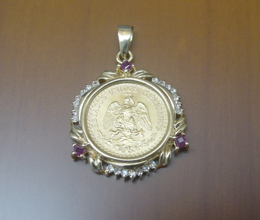 ◆98【T.B】◆98【T・B】メキシコ2ペソ イーグル金貨:ダイヤモンド:0.12ct &ルビー巻き(21.6K)ペンダントトップ