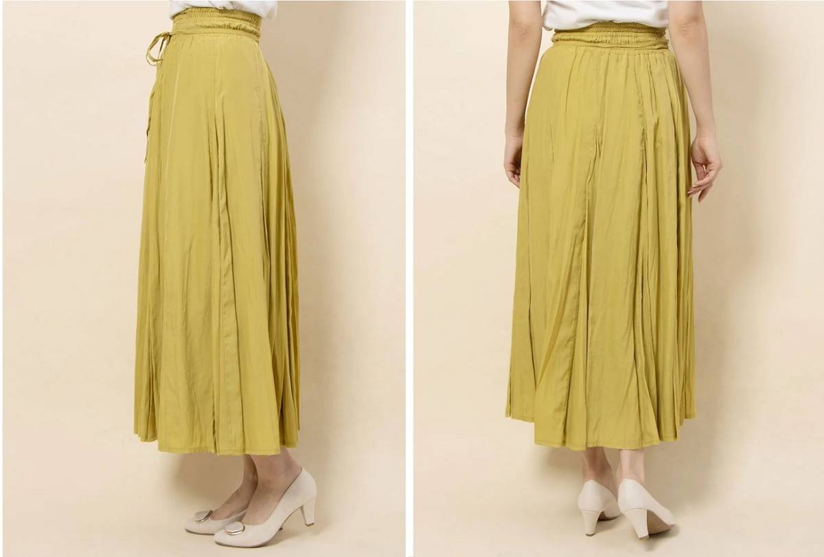 ナチュラルな光沢感のあるサテンシフォン素材で軽やかなシャーリングタックスカート。