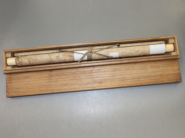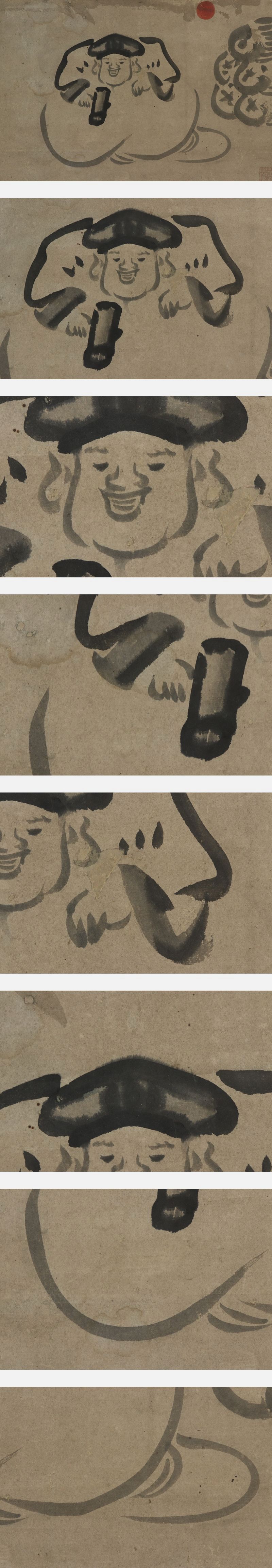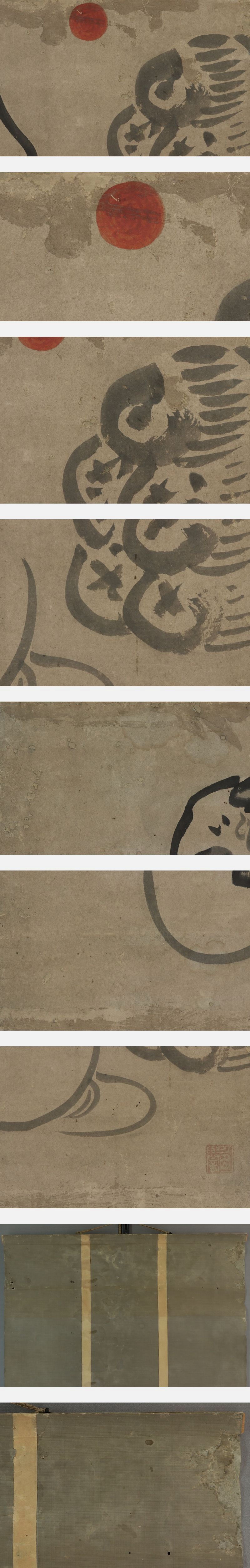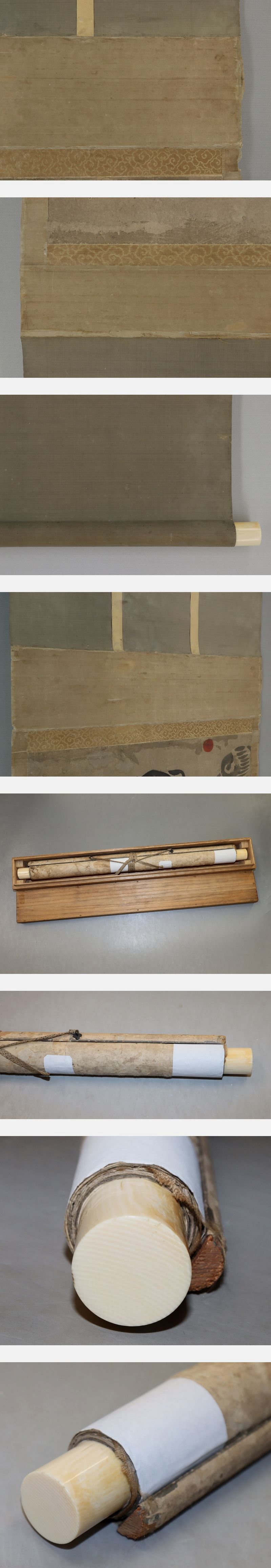 明誉古磵 みょうよ-こかん(1653-1717) 江戸中期の浄土宗の僧。 京都報恩寺住職。号は澄蓮社明誉虚舟古磵。初めは大和郡山西巌寺に住した。 晩年は西岩倉に閑居して狩野永納に画を学び、のち雪舟の画風を慕って山水人物、 とりわけ大黒の像を多く描いた。享保2年寂、65才。 本紙は、染み、汚れ、折れ、皺、虫食い、擦れ、生地剥れ、ヤケ、時代感があります。 表装は、染み、汚れ、折れ、皺、虫食い、破れ、ほつれ、くすみ、生地剥れ、修理痕、 軸先にヒビと欠け、軸紐に劣化あります。 【サイズ】 作品 横約43.5cm×縦約27.5cm 表装 横約48cm×縦約107cm |