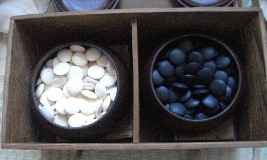 碁石は白石が日本蛤ですが、1個割れてしまったため、1個足りません。 握った時、洋蛤よりしっとりとした感じがします。 |