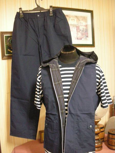 イージーカジュアルに最適 べステッドスーツ。スポーティッドフードデザインのベスト上下スーツ。 着やすい前ジップデザインの前あき仕様の個性的カジュアルスーツ。左右物が沢山入れられる大き目 こだわりデザインの両前ボタン付きポケット。マドラスチェック裏地のベストジャケット です。パンツは 紐付きで はき易い 伸縮ゴムウエストデザイン。  前に2個 そして バックに実用的ボタン留めバックポケット。穿きやすいパンツデザインです。 超実用的でもある便利 ベストパンツスーツ です。 個性的ラフ感覚な カジュアルべステッドスーツ です。生地は ネイビー色 の綿混地です。素材は 薄地っぽい しっかりした 涼しさを感じる 綿 35% ポリエステル 65% です。アーバンティ感覚のカジュアルスーツです サイズ(平置実測採寸)は 肩幅(ベストゆえ狭め) 40cm(表示 L) 着丈 60cm 身幅(脇下) 58cm 身幅(胴回) 55,5cm  紐付きゴムウエスト(実測) 74~94cm(表示 84~94cmの L ) 渡り幅 37cm 腿幅(股下10cmの所) 34,5cm 裾幅 24cm 前股上 29cm 股下(裾下より 2,5cmの所でミシンステッチ仕上) 79,5cm です。以上 Lサイズ 表示 です。 適応サイズ表示は 胸囲 96~104cm 胴囲 84~94cm 身長 175~185cm の表示ラベルです。そして、サイズ数値でお判りの様に ベストデザイン パンツも伸縮ウエストのフリーゆえ Mサイズ LLサイズ 着用の方もOKです。 勿論 新品です。念の為 測定数値をよく吟味して下さい。 尚 毎週木曜日は業務定休日です。ご連絡、ご発送とも木曜明けの金曜日にずれ込む事 ご了承下さい。よろしくお願い申し上げます。