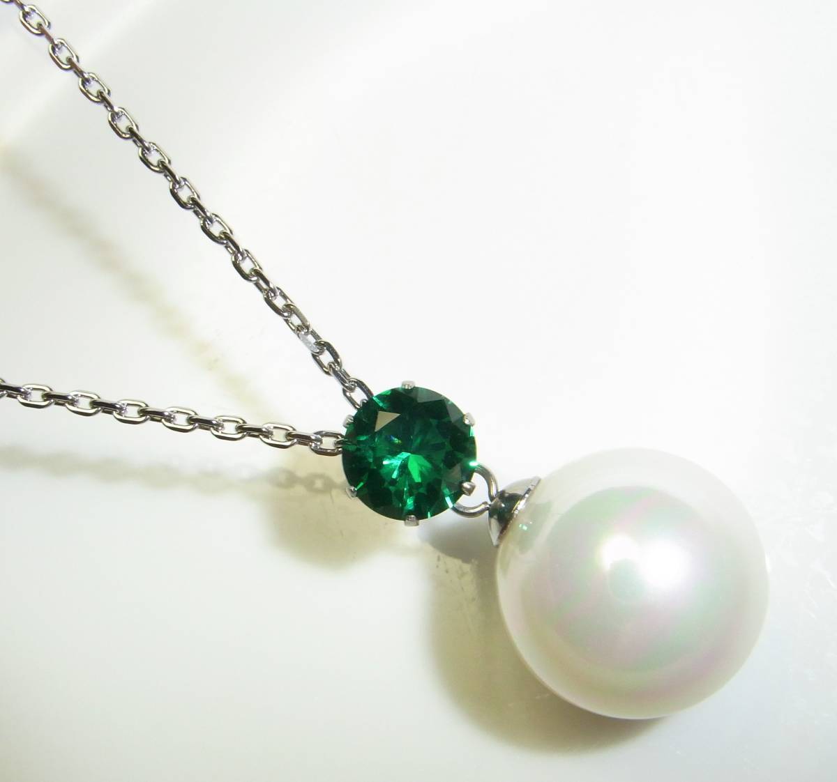 ★高級あこや真珠タイプ 虹色 エメラルド ステンレス ネックレス ペンダント★ | |||