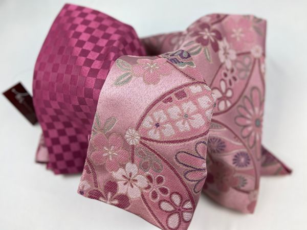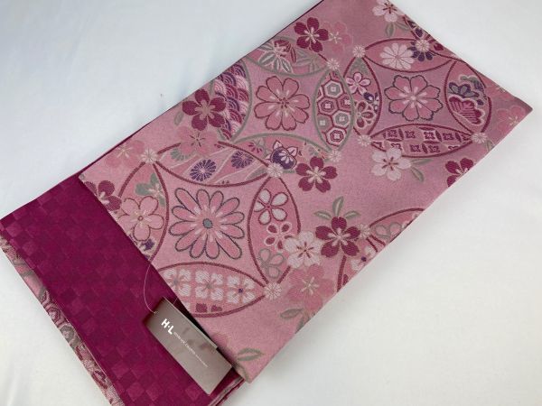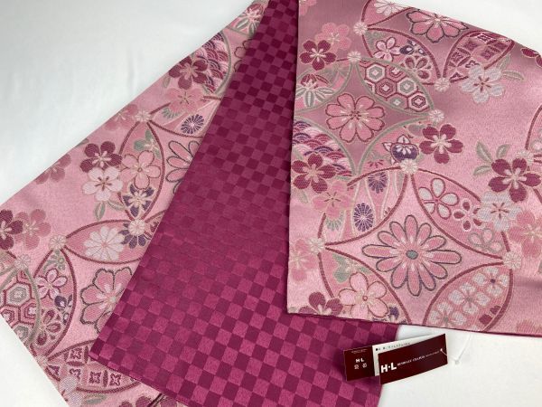色  珊瑚色系花柄 × 赤紅色系市松柄  リバーシブル袋帯