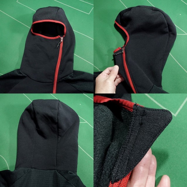 フードは鼻までをカバーし、フロントジッパーはダブル引手で、口・鼻に干渉しない様に斜めに配置されています。