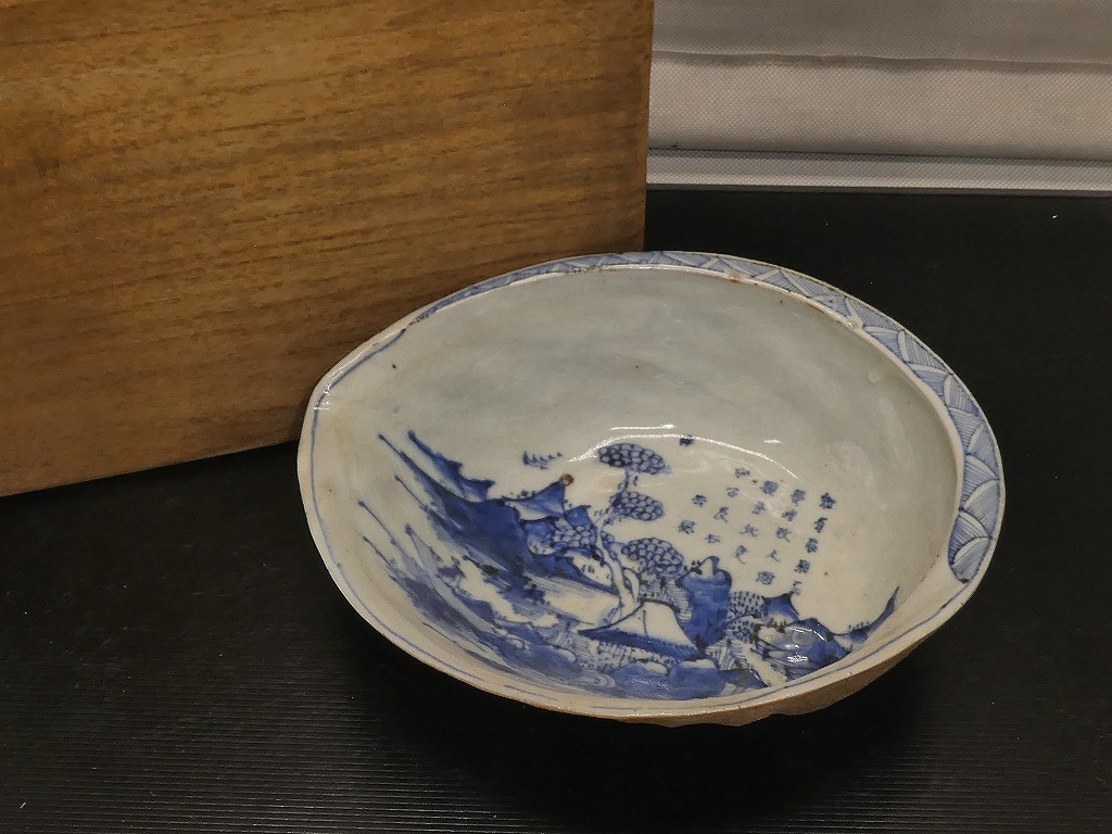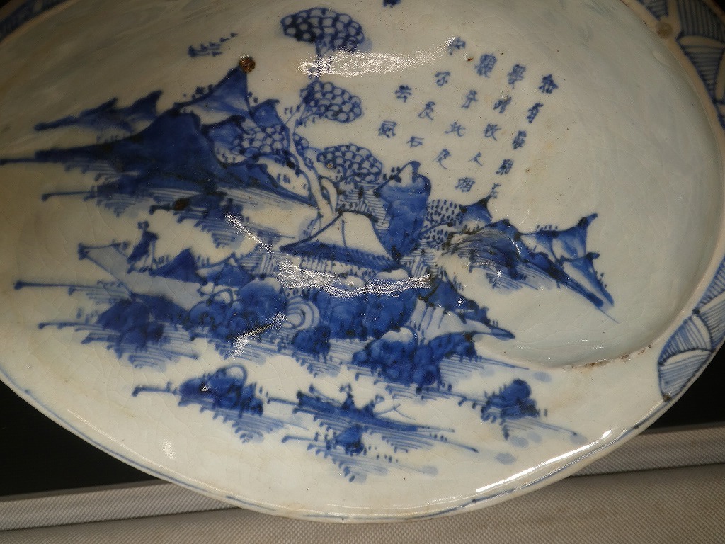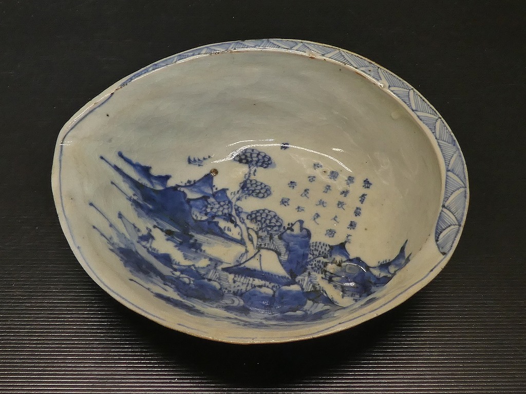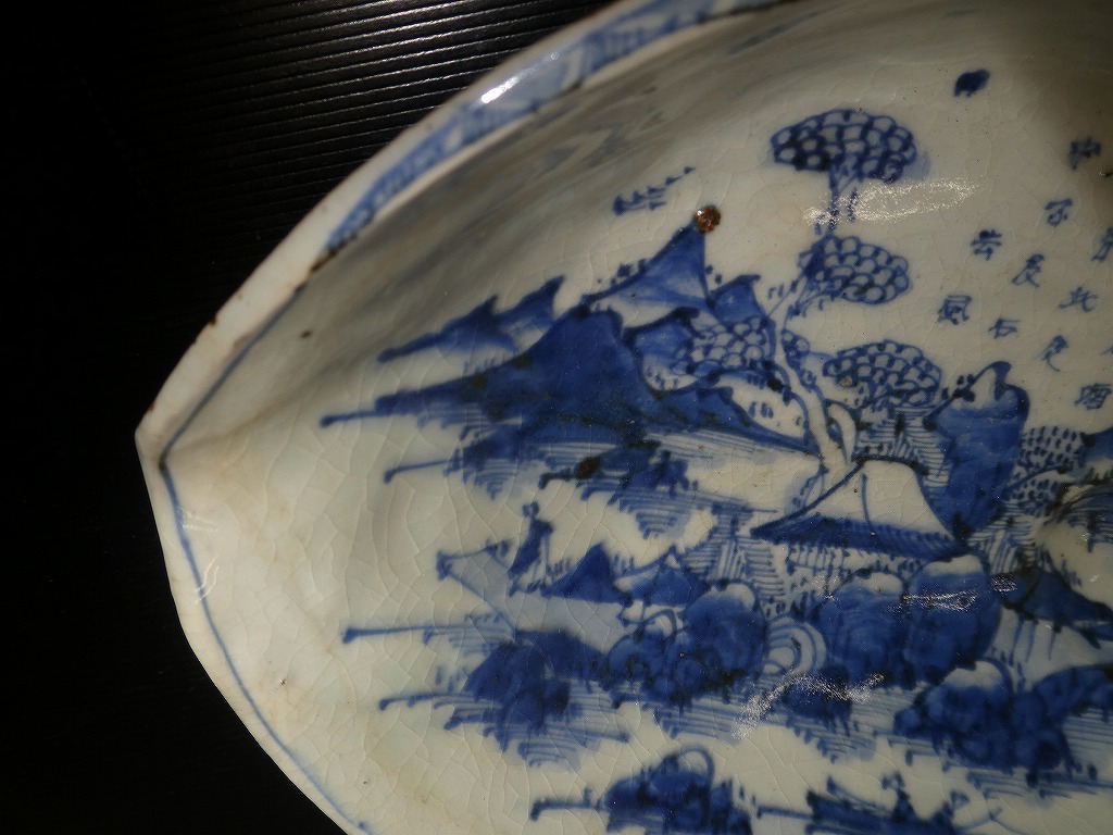 ●●古染付 山水 漢詩文 鮑型 菓子器 水盤 共箱 時代物 古美術 茶道具●●