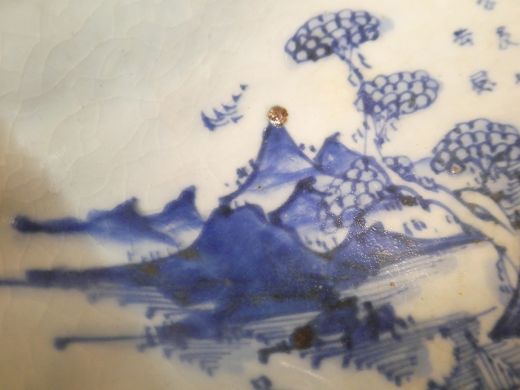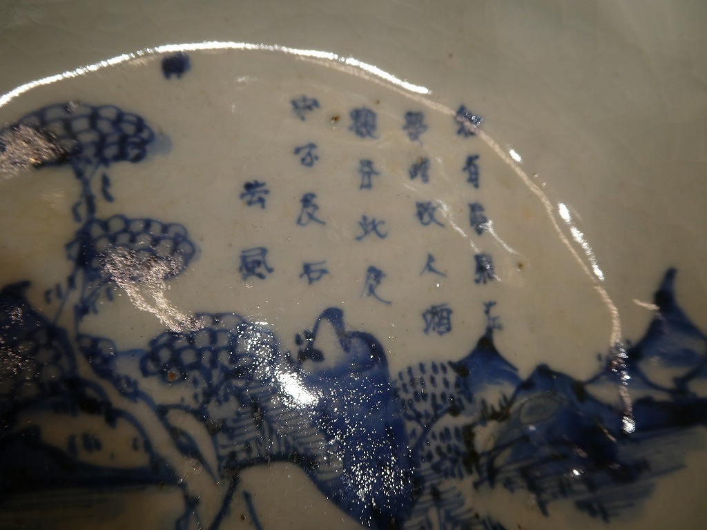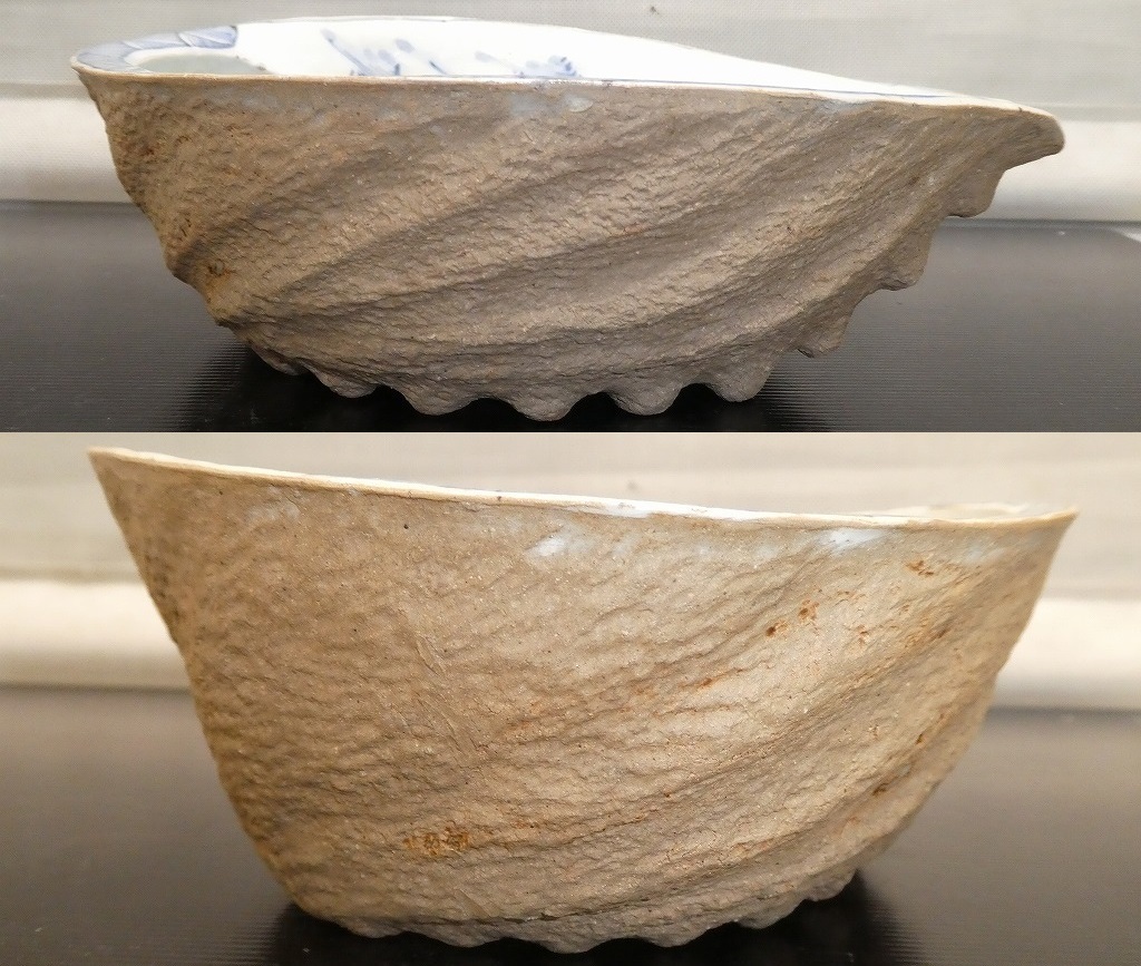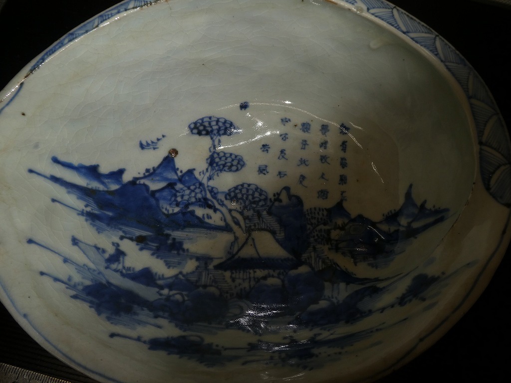 ●●古染付 山水 漢詩文 鮑型 菓子器 水盤 共箱 時代物 古美術 茶道具●●