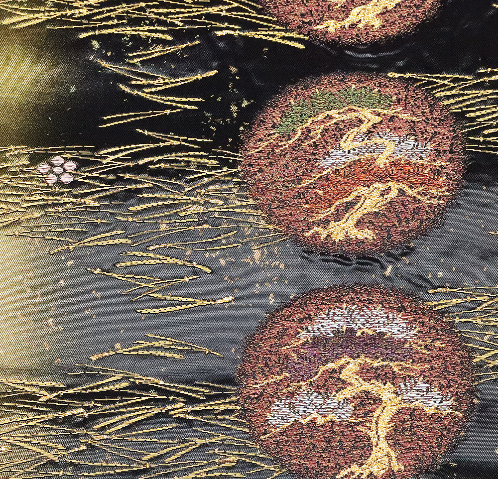 | 色・柄 | 西陣織袋帯 黒・金引き箔地 松丸紋・松竹梅 (写真では上手く色が出ない場合があります。ご了承下さい) ※お使いのディスプレイの種類や設定の差により 実物の色と画像の色が少々異なることもございます。 写真の枚数が多いので一度パソコンでご覧ください。 |
