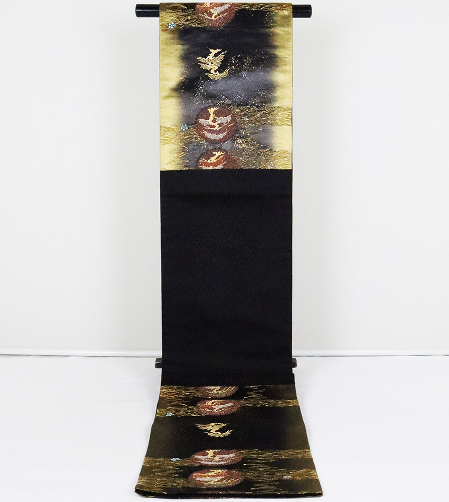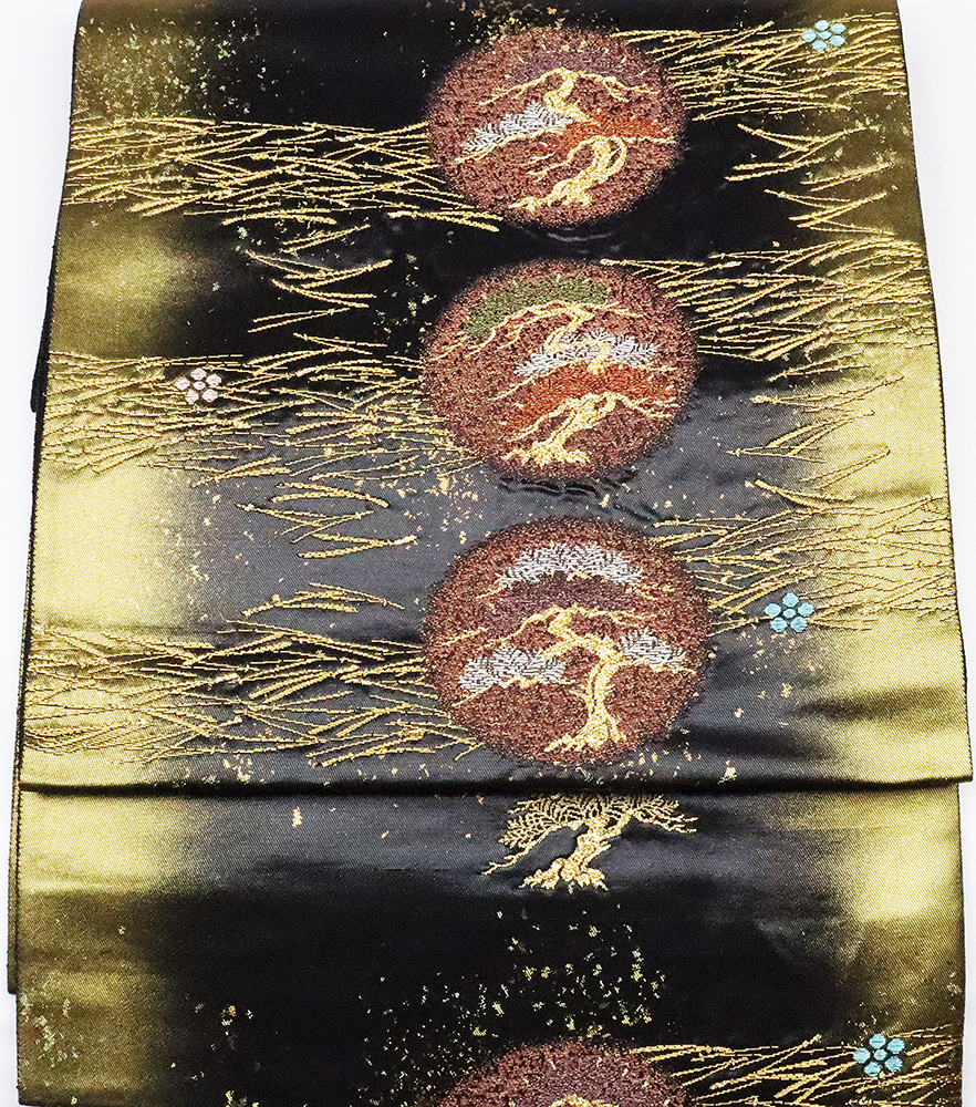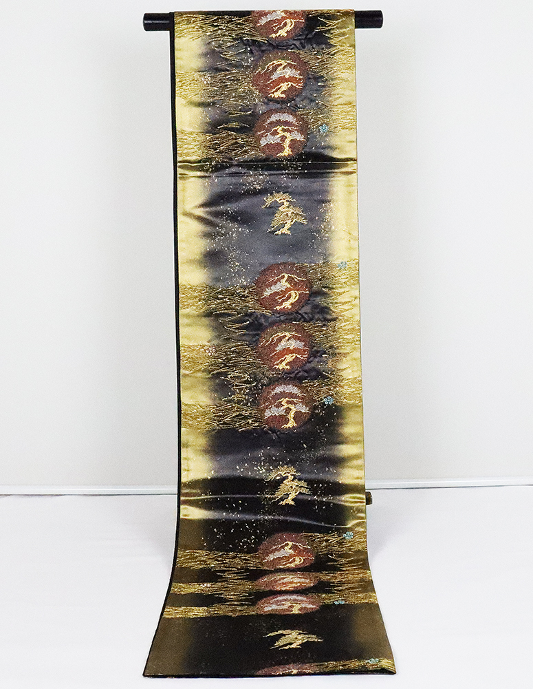 | 西陣織袋帯 黒・金引き箔地 松丸紋・松竹梅 未使用品 仕立て上がり | |